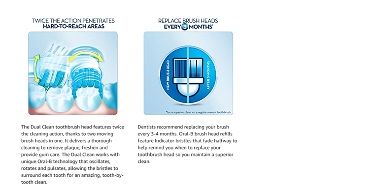 Two Moving Brush Heads in One. The Dual Clean toothbrush head features twice the cleaning action thanks to two moving brush heads in one. It delivers a thorough cleaning to remove plaque, freshen and provide gum care. The Dual Clean works with unique Oral-B technology that oscillates, rotates and pulsates, allowing the bristles to surround each tooth for an amazing, tooth-by-tooth clean.