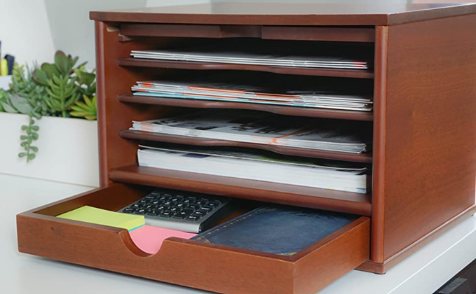 The Victor Midnight Black Collection brings a fresh perspective to desk accessories by offering functional solutions with appealing design elements. The 4720-5 Desktop Organizer provides four shelves and one large drawer for flexible storage of files and desk supplies. The sliding door on top pulls out and closes in front to easily hide contents when you want a clean look. Combine two or more Desktop Organizers to create an elegant literature rack or storage system. Features sturdy 11.9 lb. wood construction with a durable double coated matte black finish. Stylish 14" x 10.75" x 9.75" design with crown molding base makes a great addition to any desk. Perfect for use either at home or in the office. Enter the search term “Victor Midnight Black Collection” to see the entire lineup including: Corner Shelf, Printer Stand, Stacking Letter Tray, Business Card Holder, Monitor Riser, Magazine Holder, Tidy Tower, Incline File, Reversible Book End, Pencil Cup with Note Holder.