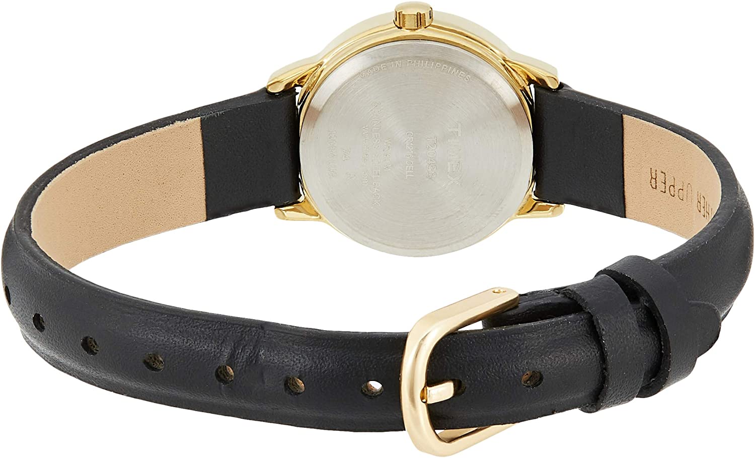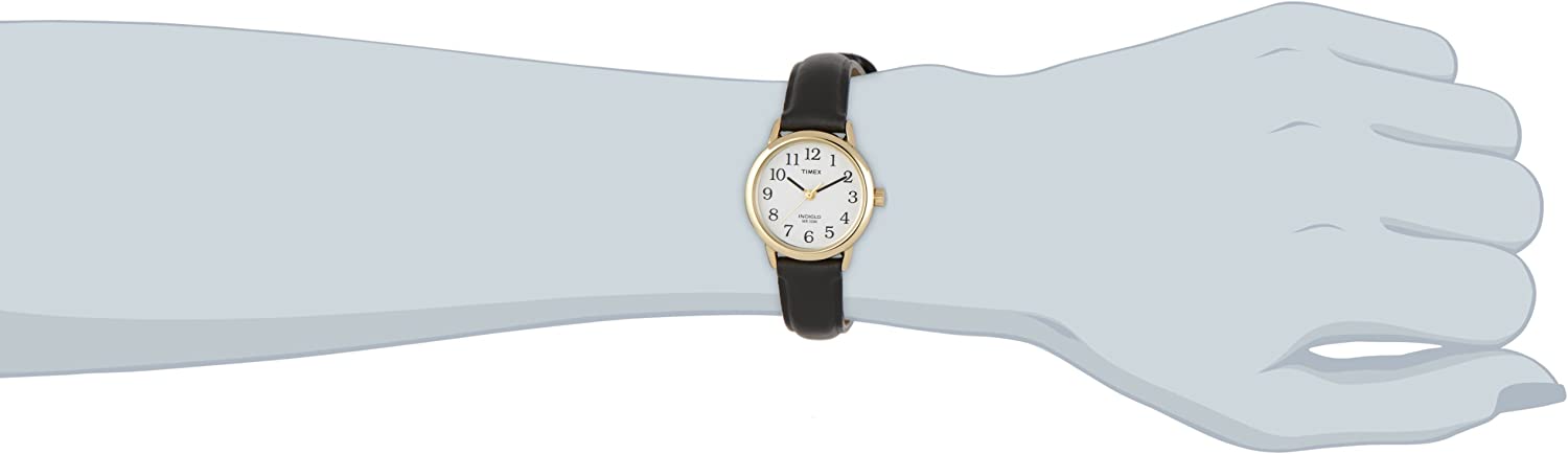 Never struggle to read the time, thanks to Timex's Women's Easy Reader Gold-Tone Black Leather Watch. Clean, classic lines give this style its streamlined appeal, and a comfortable black leather strap ensures long-term, comfortable wear. A slender, circular gold-tone case surrounds a bright white dial, complete with black-tone Arabic numerals and hands. Quartz movement provides reliable accuracy, while water resistance to 99 feet and a mineral crystal help protect against damaging wear and tear.