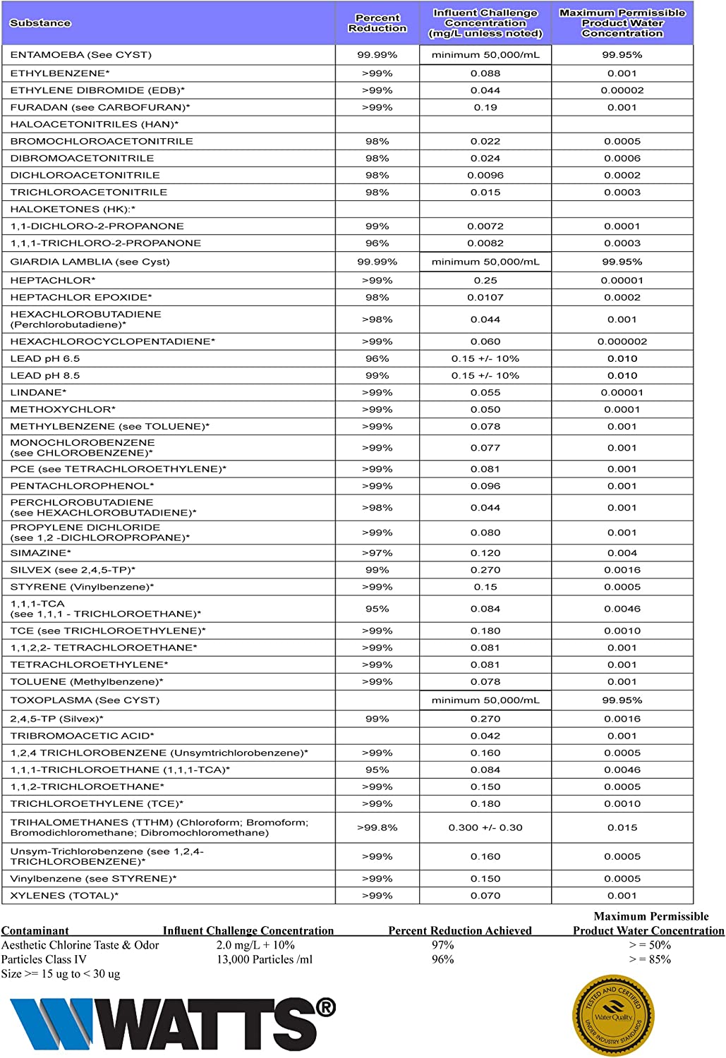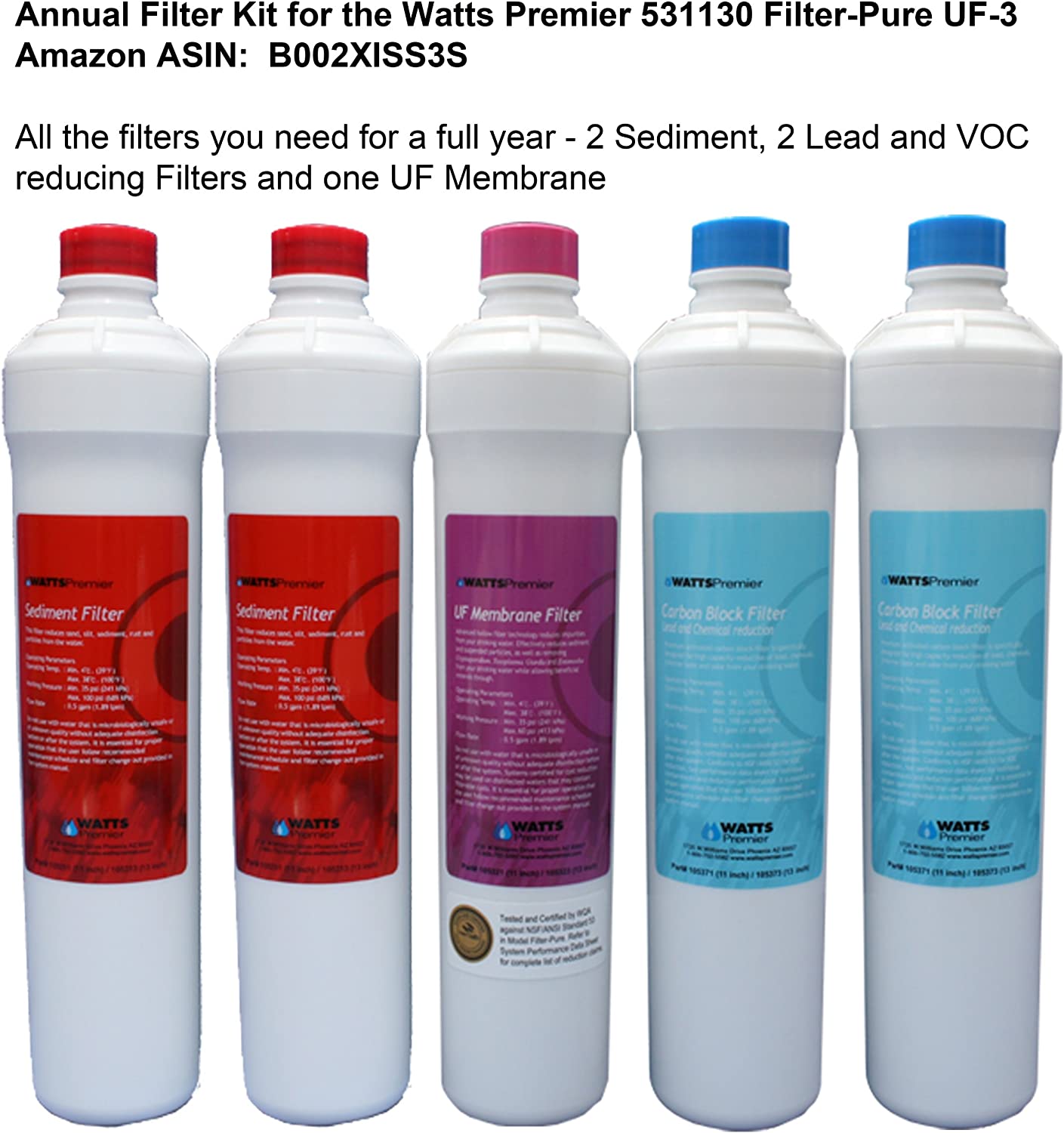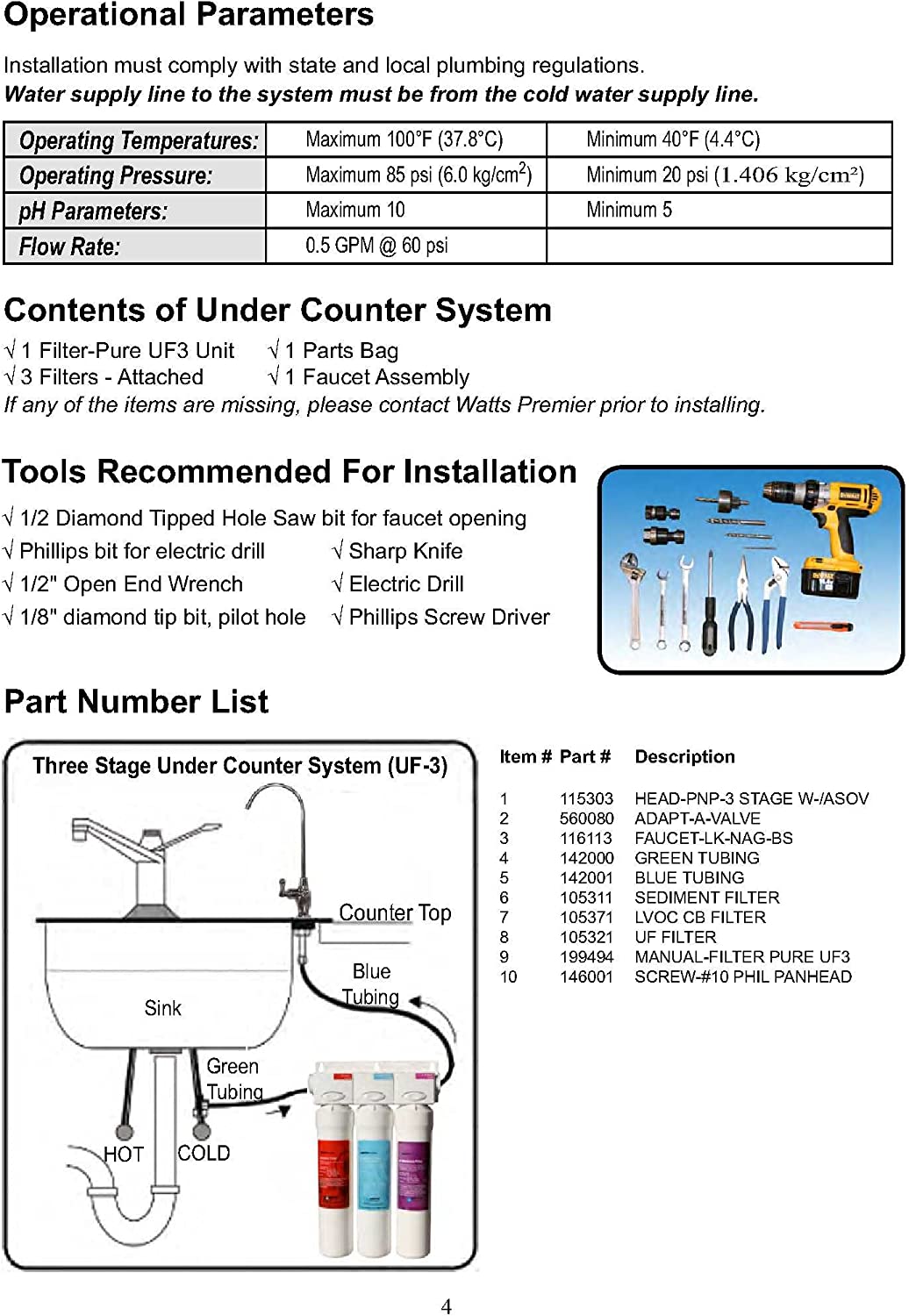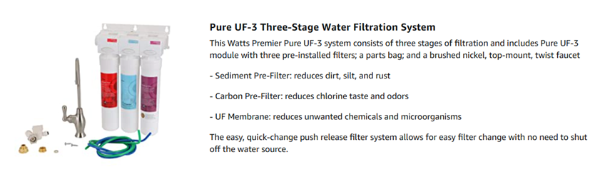 • This Watts Premier Pure UF-3 system consists of three stages of filtration based upon these treatments: sediment pre-filter reduces dirt, silt and rust; the carbon pre-filter reduces chlorine taste; and the UF membrane reduces unwanted chemicals