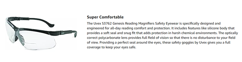The Uvex Genesis is the best selling safety eyewear in the world, offering the best in comfort, protection and style. Built with patented Multi-Material Technology and a high level of adjustablilty, the Uvex Genesis delivers a broad range of superior benefits. Genesis provides workers with extraordinary all-day comfort and raises the bar on compliance. Genesis Reader Magnifiers are an excellent choice for workers needing increased magnification for close-up inspection, fine detail work and reading smaller print. Available in five diopter strengths from +1.0 to +3.0 magnifications. Made in the USA.