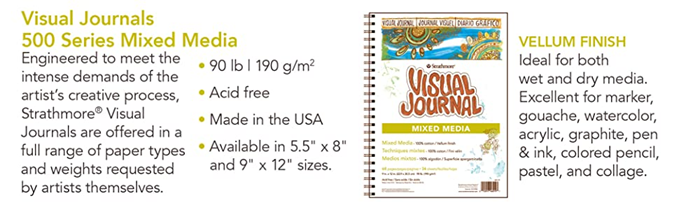 Strathmore 500 Series Visual Mixed Media Journal, 9"x12" Vellum, Wire Bound, 34 Sheets Product description (optional) : Strathmore-Visual Journal: Mixed Media. This package contains one 12x9 inch spiral-bound art pad. It is filled with sixty-eight pages of 90-pound paper with a vellum finish. It is great for wet and dry media including watercolor, acrylic, pen and ink, pencil, crayon, charcoal, marker, and collage. Acid free. Made in USA. This item is manufactured in United States.