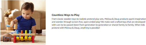 From classic wooden toys to crafts, pretend play, and games, Melissa & Doug products provide a launch pad to ignite imagination and a sense of wonder in all children so they can discover themselves, their passions, and their purpose.Since the company’s founding more than 25 years ago, Melissa & Doug has consistently delivered innovative products that inspire open-ended thinking, encourage kids to see new possibilities, and offer Countless Ways to Play. It’s part of a bigger vision to Take Back Childhood. Because by giving children a true childhood with the space and freedom to explore their world, we give them a path to realizing their full potential!
