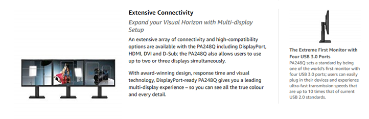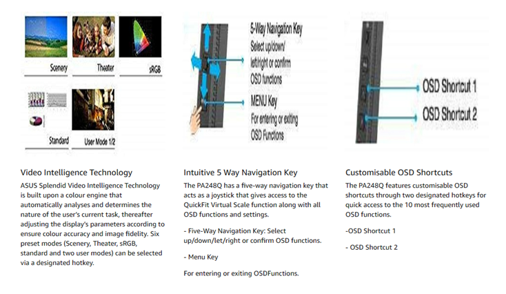 Experience professional-grade color accuracy and reproduction with the ASUS PA248Q ProArt display featuring 16:10, 1920 x 1200 HD A+ IPS panel for 178 Degree ultra-wide viewing angle. Each PA248Q is factory pre-calibrated to 100% sRGB color with color differential of ∆E < 5 right out of box