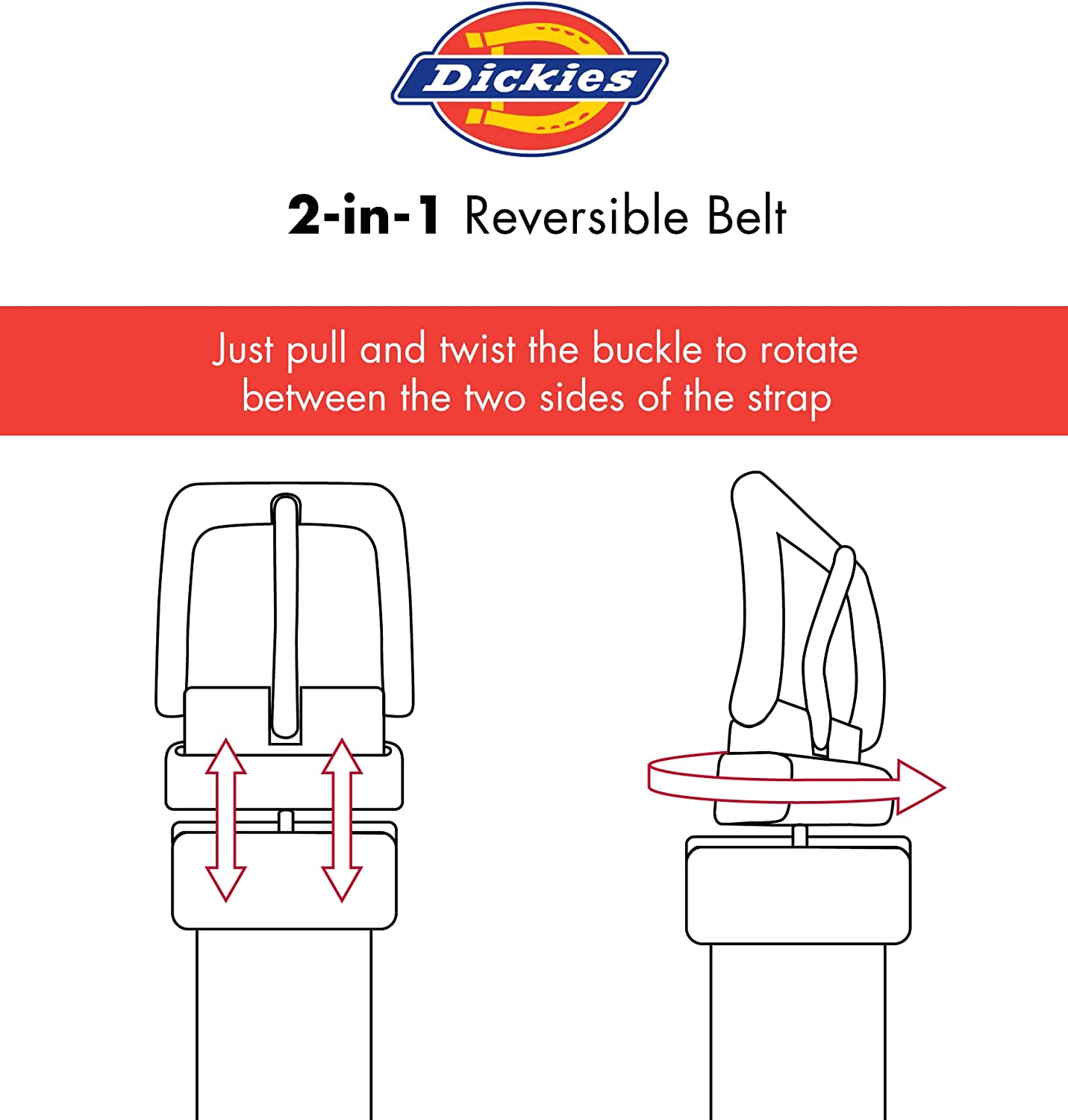 An essential accessory in every men's wardrobe, this Dickies men's belt will feel secure and comfortable for all-day wear. This belt features a 2-in-1 reversible belt strap to create versatile looks while not taking up space in your closet. Dickies takes pride in designing belts that are made for your everyday life - from work to family time, these belts are proven to be durable and crafted to last.