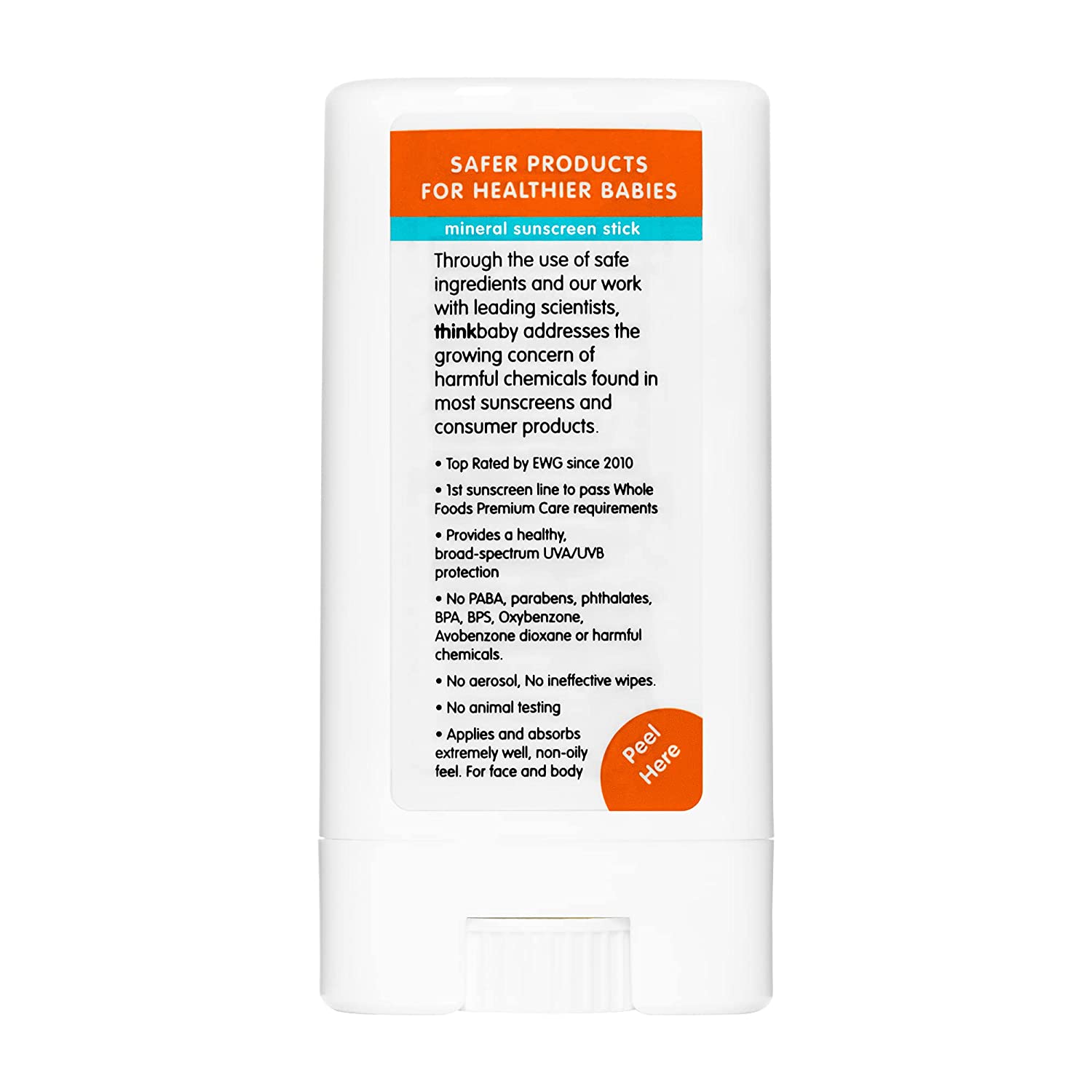 CLEAN MINERAL FORMULA: The first sunscreen to pass Whole Foods Premium Care requirements, Thinkbaby vegan, Leaping Bunny certified sun creams contain no PABA, parabens, phthalates, BPA, oxybenzone, avobenzone, petroleum, gluten, dairy, or toxic chemicals.