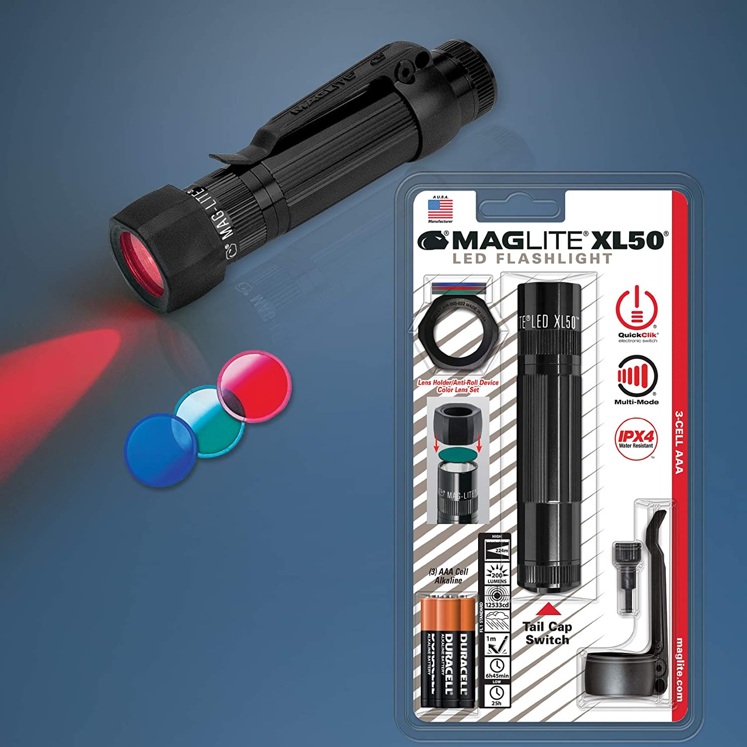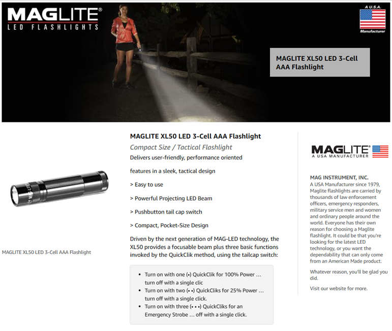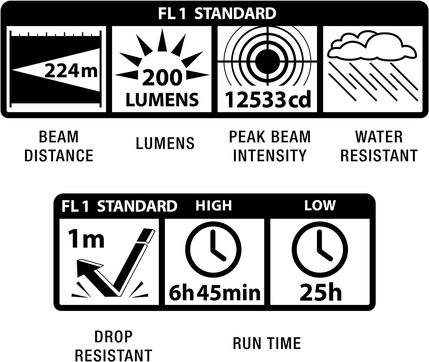 Handheld Flashlight, Flashlight Grade Tactical, Rechargeable No, Lamp Type LED, Flashlight Battery Size AAA, Flashlight Battery Type Alkaline, Number of Batteries 3, Batteries Included Yes, Battery Burn Time 6. 8 hr. , Length 4. 80 In. , 200 Lumens, Lumens Range 100 to 249, 6. 8 hr. Run Time on High Setting, Maximum Lumens Output 200, Body Color Black, Body Material Aluminum, Body Dia. 1. 00 In. , Switch Type Push Button, Lens Material Polycarbonate, Safety Rated Not Safety Rated, Beam Distance 224m