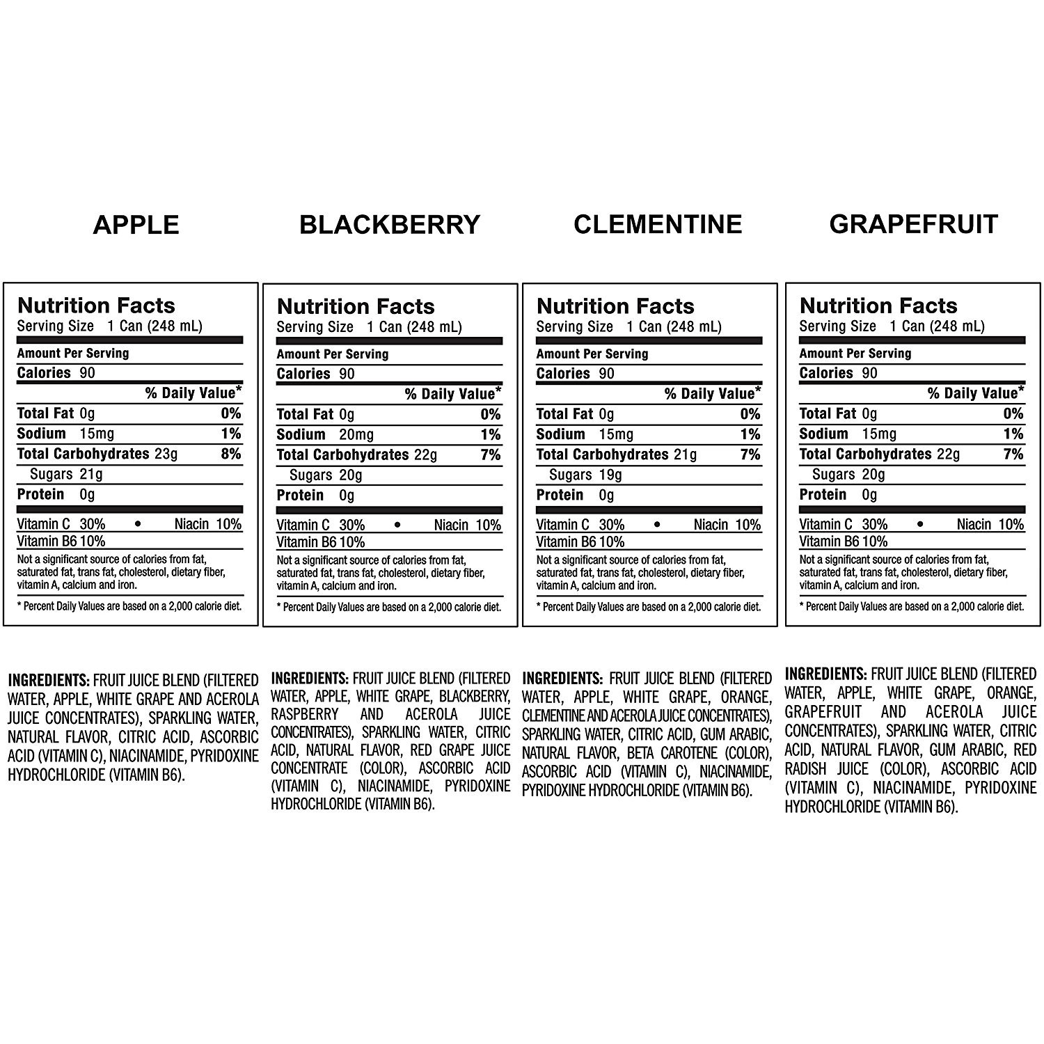 Includes Sparkling Blackberry, Sparkling Clementine, Sparkling Apple, and Sparkling Grapefruit flavors - 6 cans each