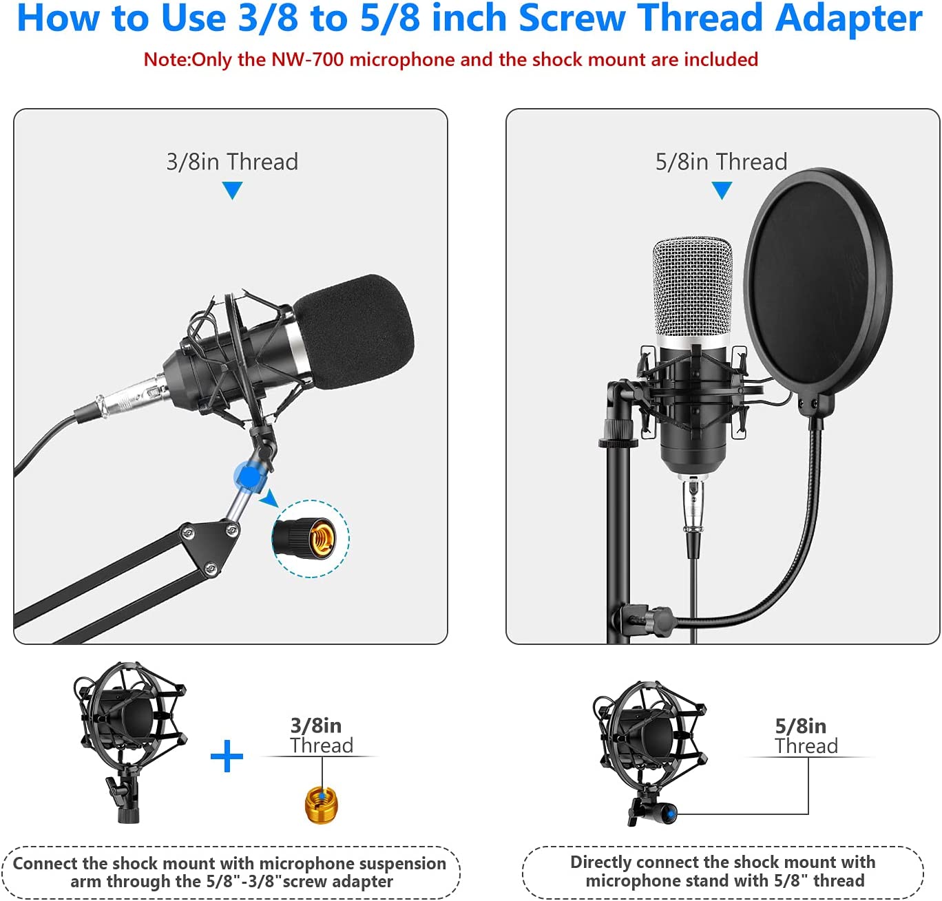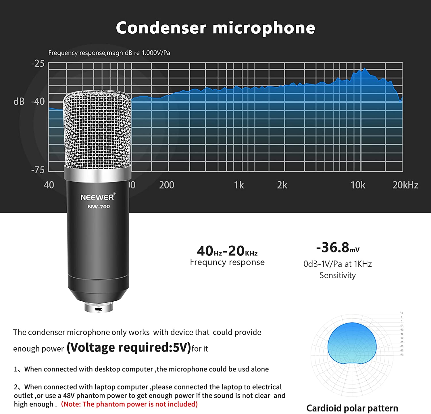 The Set Includes: (1)Black NW-700 Professional Condenser Microphone + (1)Metal Microphone Shock Mount + (1)Ball-type Anti-wind Foam Cap + (1)Microphone Power Cable.
