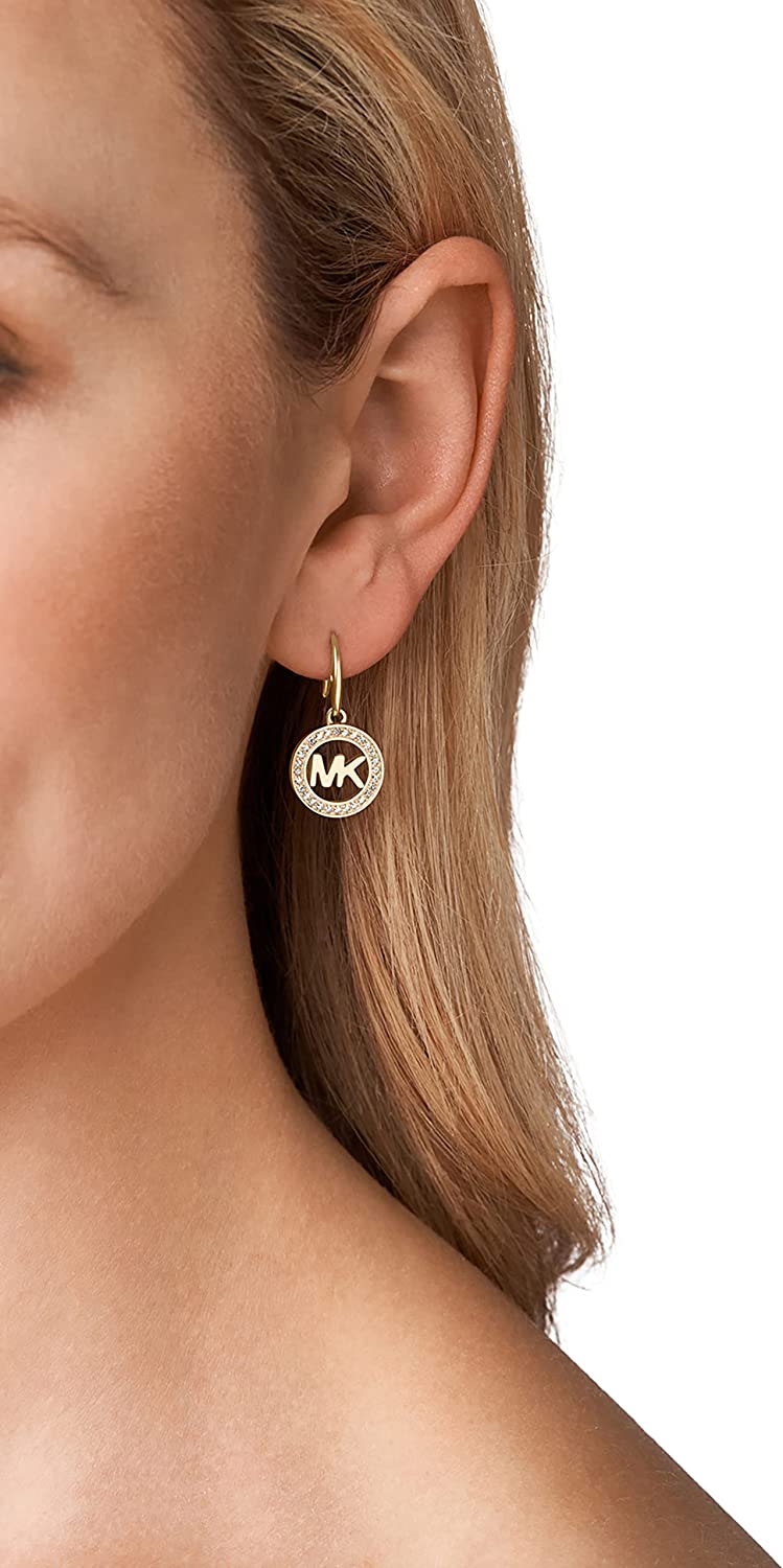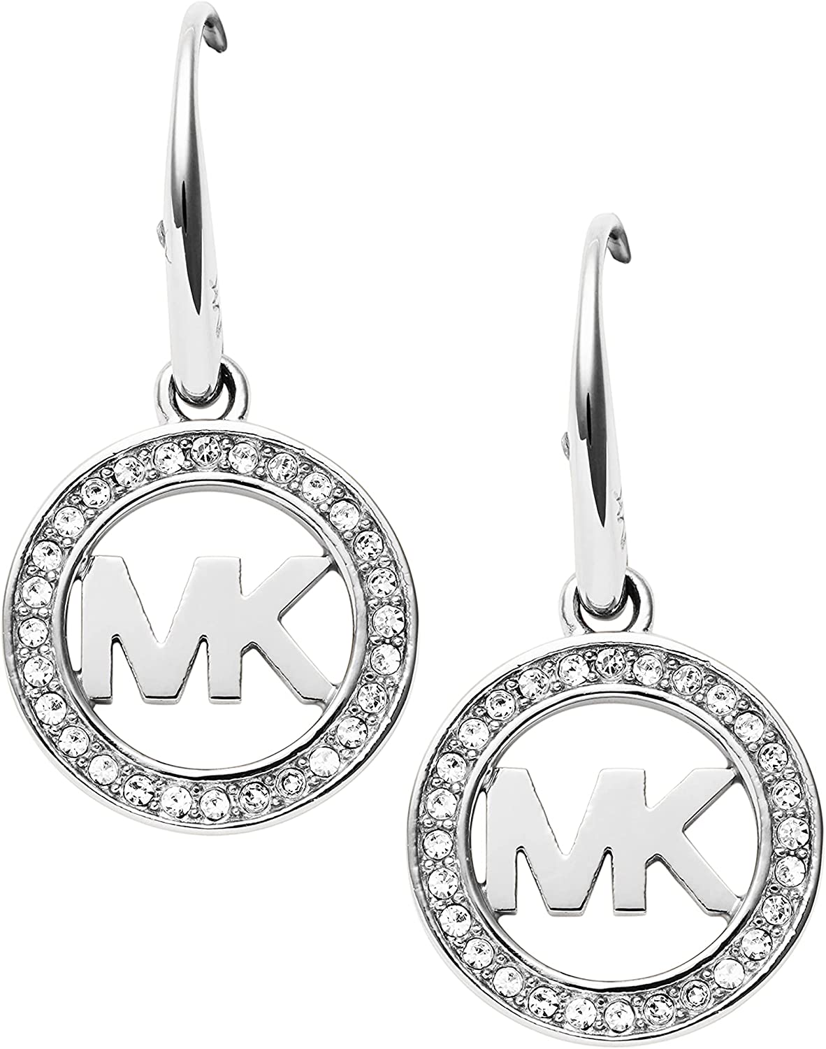 These stainless steel drop earrings feature the classic Michael Kors logo surrounded by sparkling pave crystals.