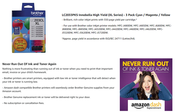 The LC2033PKS are also Amazon Dash Replenishment eligible replacement cartridges. Upon Activation, Amazon Dash Replenishment–eligible Brother printers will seamlessly order Brother Genuine supplies through your Amazon account and ship them directly to your door. The Brother Genuine LC2033PKS replacement high yield color ink cartridges can print approximately 550 pages/cartridge in accordance with ISO/IEC 24711(Letter/A4) standards. Once you’ve ordered your replacement cartridges from Amazon, you can feel comfortable knowing that Brother has an environmentally smart solution. Brother is dedicated to being environmentally responsible and offers disposal programs for properly discarding its cartridges.