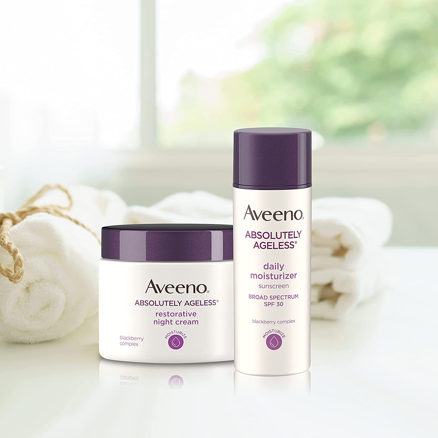 • 1.7-fluid ounce jar of Aveeno Absolutely Ageless Restorative Moisturizing Night Cream works overnight to moisturize and nourish skin