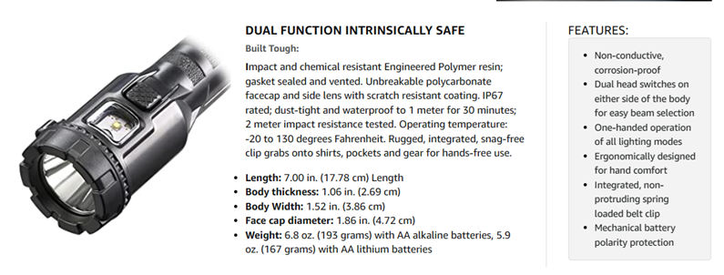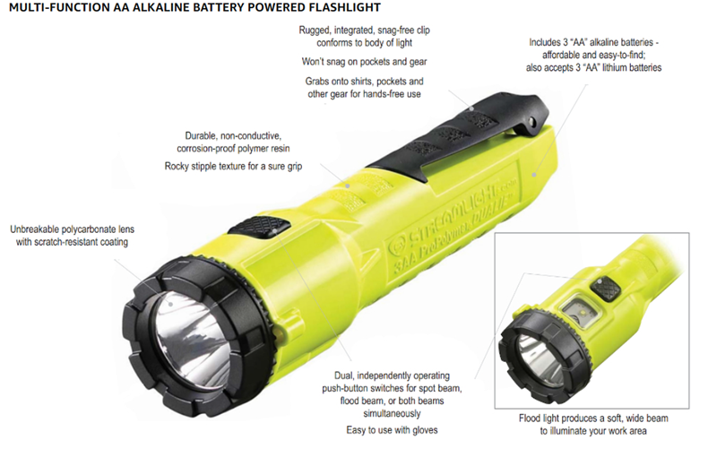 See what's ahead of you and around you with the intrinsically safe3AA ProPolymer Dualie. It produces a focused spot light and soft flood lightto illuminate your work area and help to avoid slips, trips and falls.