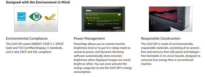 Enjoy widescreen performance, any way you want it. With a 24" 16:10 panel, IPS technology and LED backlight, the U2412HM provides a brilliant view, plus amazing adjustability to suit any style. Your monitor, your style. The ultimate in flexibility and customizability, the U2412HM monitor can be adjusted to suit your workspace, tailored to suit your viewing preferences, and with its wide viewing angle, it can be viewed from almost any position. Designed with the environment in mind. Your workspace isn't the only environment that can benefit from the U2412HM.