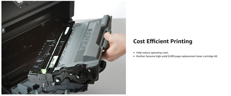 A perfect all-in-one office solution for small to medium-sized businesses, the Brother Business Laser MFC-L5800DW was engineered to help streamline office efficiency. With a print and copy speed of up to 42 pages per minute(2), this high-performance all-in-one produces professional-looking reports, spreadsheets, and other important documents with crystal-clear precision and accuracy. This Brother Business Laser All-in-One is a small office printer, copier, scanner, and fax machine that offers simultaneous operation (meaning that you can scan and print simultaneously). Also, a built-in automatic duplex printing function permits you to print on both sides of the paper, helping save money and resources. The MFCL5800DW multifunction printer offers multiple types of connectivity with Ethernet and wireless interfaces and mobile device printing and scanning support for most smartphones and tablets. (3) The easily navigated 3. 7-inch color touchscreen offers the option of creating up to 48 customized shortcuts for frequently used functions. Users can also scan to or print from popular business cloud services directly from the 3. 7-inch touchscreen display without using a computer via Evernote, Google Drive, Dropbox, and more. (1) This Brother all-in-one offers a 70-page capacity automatic document feeder for copying and scanning multi-page documents. The adjustable 250-sheet capacity paper tray and 50-sheet capacity multipurpose tray make printing and copying simple. This printer can be upgraded to a 1, 340-sheet total capacity with optional trays. The MFC-L5800DW is also Dash Replenishment enabled. This system allows the printer to measure the toner level of your Genuine Brother Replacement Cartridges and automatically order replacements. This ensures you never run out of toner so that you can maintain the office efficiency you expect and require. (1)Requires an Internet connection and an account with desired service. (2)Based on one-sided printing. Change from default setting required. (3)Requires connection to a wireless network. (4)Approximate toner cartridge yield in accordance with ISO/IEC 19752 (letter/A4).