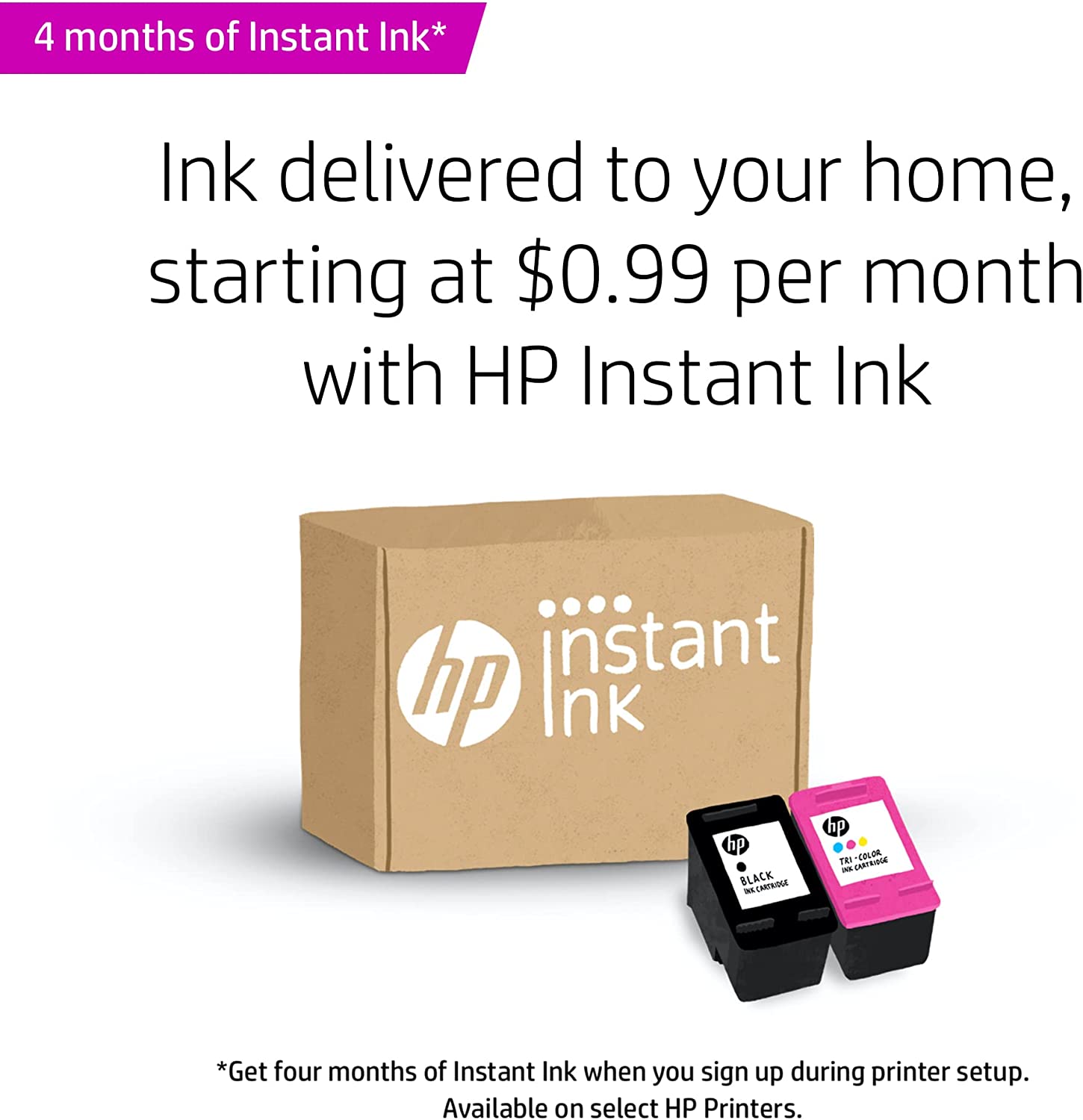 Ink delivered to your home: get your first 4 months free when you enroll in HP Instant Ink (optional) during printer set up; plans starting at 0.99 dollar per month after the trial period, shipping and recycling included
