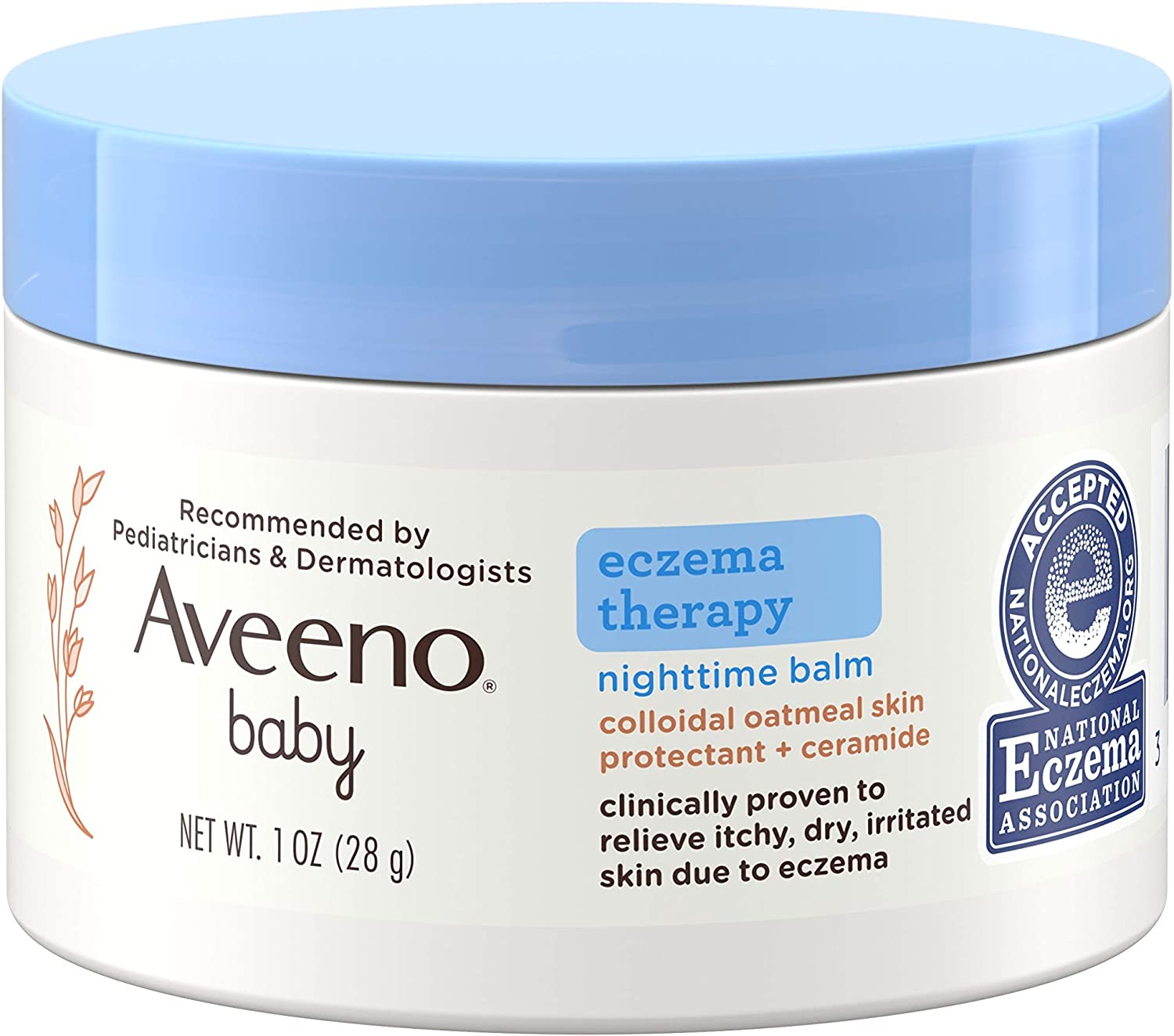 1-ounce of Aveeno Baby Eczema Therapy Nighttime Balm in a TSA-compliant travel sized jar, designed to help soothe your baby's dry, itchy & sensitive skin due to eczema on-the-go