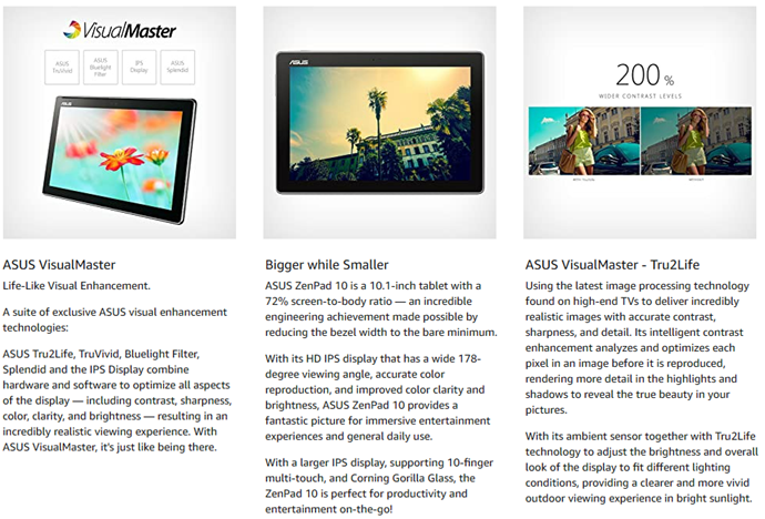 ASUS ZenPad 10 delivers exceptional performance with Quad-core processor, 2GB memory and 16GB on board storage. It also has any-way-up USB-C, rapid fingerprint security, and high-capacity 4680mAh battery to keep the entertainment going.