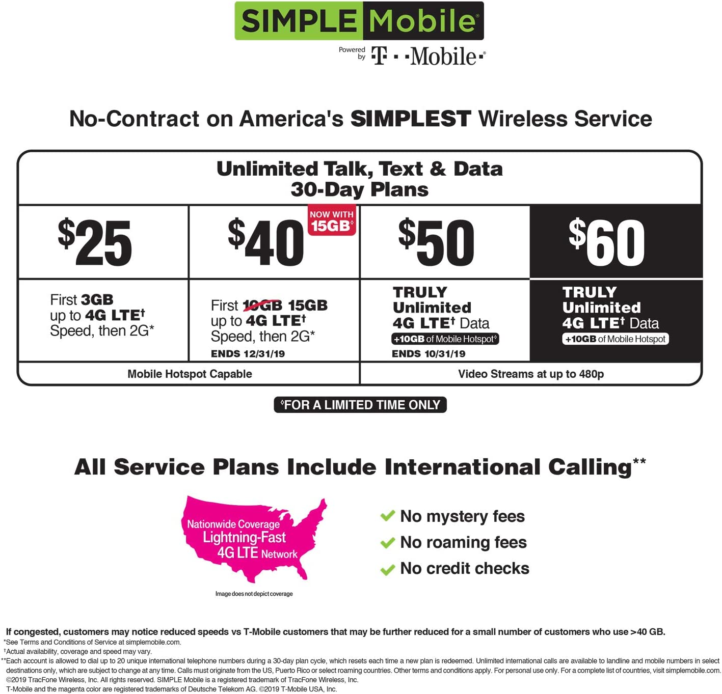 • PLANS - Simple Mobile offers a variety of coverage plans, including 30-Day Unlimited Talk, Text & Data. No activation fees, no credit checks, and no hassles on a nationwide lightning-fast network. For more information or plan options, please visit the Simple Mobile website.