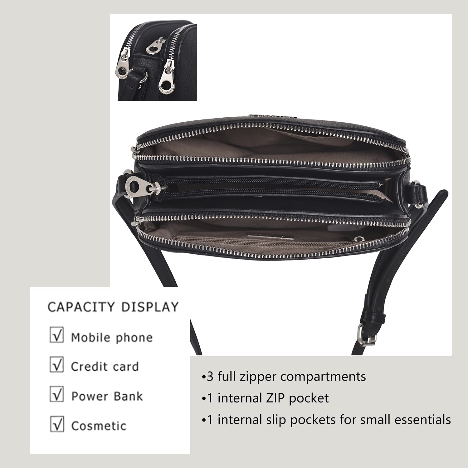 MATERIAL:Silky feel Soft PU Leather Functional 3 Zip pockets Compartments Crossbody Purse for women and girls.Sturdy to keep it's shape and stand up on its own.Wipe clean easily!Quality silver hardware.