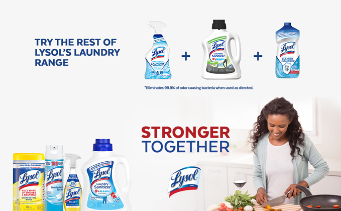 Our clothes are in constant contact with bacteria throughout our day-to-day activities, for example through contact with contaminated surfaces, other people and our own bodies. Bacteria can spread from one fabric to another in the laundry basket, from the washing-machine drum to the next load. Some these bacteria can survive a wash cycle and can cause potential infection risk with pathogenic bacteria. When it comes to certain laundry loads such as children's clothes or sportswear, you want your detergent to eliminate bacteria that can cause illnesses and create lingering bad smells. But detergents alone don't actually kill all bacteria. Introducing Lysol Laundry Sanitizer, an additive specially designed to kill 99.9% of bacteria left behind. Simply add Lysol Laundry Sanitizer to your rinse cycle. It does not contain any bleach and even works in cold water so is safe to use on most fabrics including whites, colors and darks.