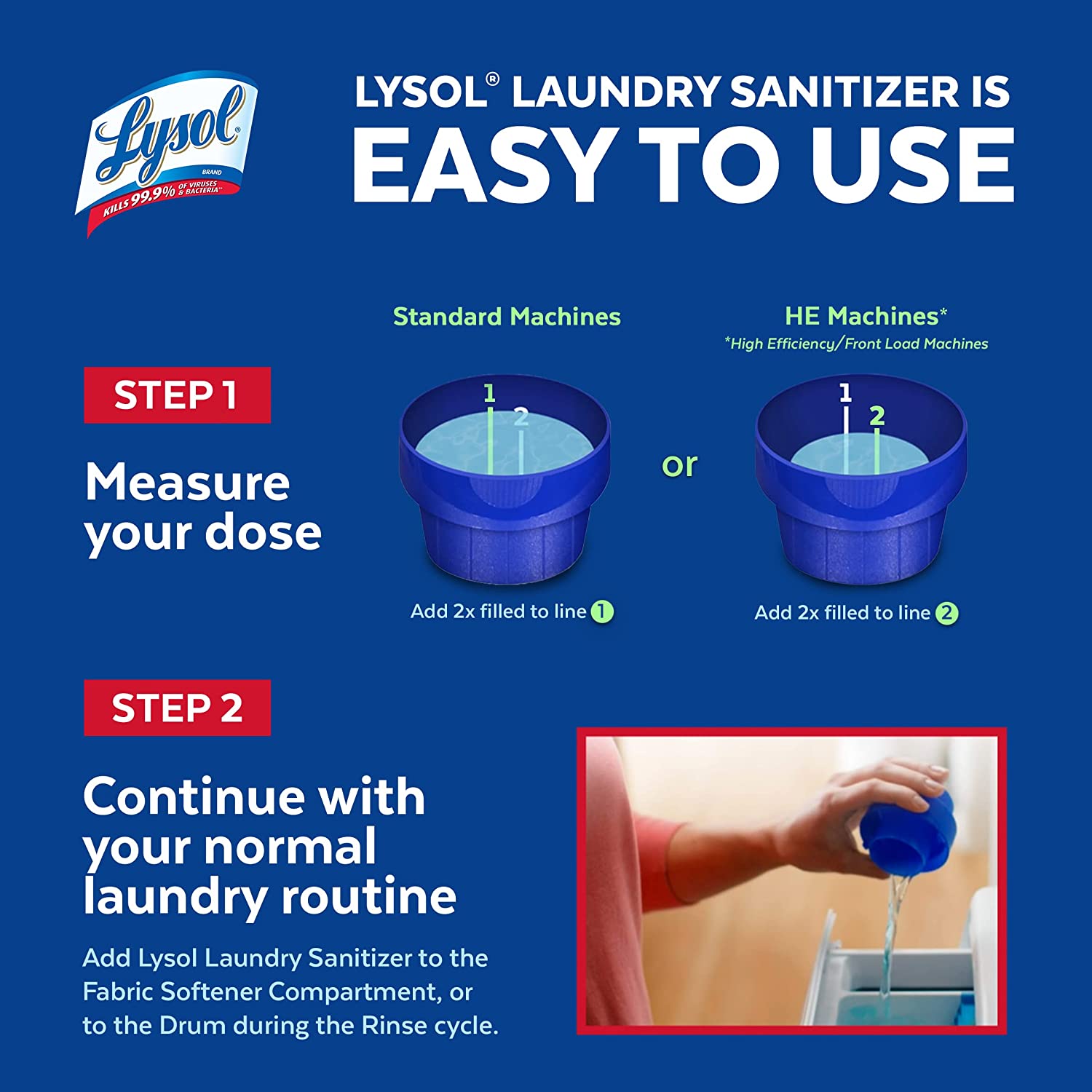Directions for Use: Add 2 capfuls each filled to line 1 of the dosing cup to the fabric softener compartment or directly to your rinse cycle wash. For High Efficiency/Front Load Machines: Add 2 capfuls each filled to line 2 of the dosing cup to the fabric softener compartment or directly to your rinse cycle wash.