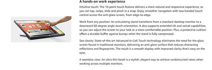 Dell 24 Touch Monitor. Viewable image size (diagonal) 60.47 cm (23.8 inches). Active display area Horizontal - 527.04 mm (20.75 inches), Vertical - 296.46 mm (11.67 inches). Maximum resolution 1920 x 1080 at 60 Hz. Aspect ratio 16:9. Pixel pitch 0.275 mm x 0.275 mm. Brightness (typical) 250 cd/m . Color gamut (typical) 84% (CIE 1976). Color depth 16.7 million colors. Contrast ratio (typical) 1,000:1, Dynamic contrast ratio 8 million:1. Viewing angle (typical) (vertical/horizontal) 178 /178 . Response time (typical) 6 ms gray-to-gray. Panel technology In-plane switching, anti-glare with 3H hardness. Backlight LED. Speaker (optional) Recommended desktop speaker ? Dell 2.0 Speaker System (AE215). Connectors 1 x DisplayPort (ver 1.2)6, 1 x HDMI (ver 1.4), 1 x VGA, 1 x USB 3.0 port upstream, 2 x USB 3.0 ports (side) (including 1 x USB 3.0 BC1.2 charging port), 2 x USB 2.0 ports (bottom), 1 x Analog 2.0 audio line out (3.5 mm jack). Touch features Type: projected capacitive system; Input: bare finger; Points: 10 touch points; Response time: 35 ms; Resolution: 4096 x 4096; Operating systems supported: Windows 10, 8.1, 7. Articulating stand Height adjustable (90 mm), Tilt (-5 to 60 ), Swivel (-30 to 30 ). VESA mounting support (wall mount kit sold separately) 100 mm x 100 mm. Security lock slot (security lock not included); Anti-theft stand lock slot (to panel) AC input voltage/frequency/current 100 to 240 VAC/50 or 60 Hz 3 Hz/1.5 A (typical). Power consumption (typical) 18W. Power consumption (ENERGY STAR) 16W. Power consumption standby/sleep mode <0.3 W