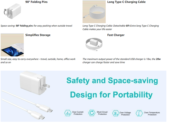 • Package - 1 X AC Charger,1 X 6Ft USB-C to USB-C Charging Cable.