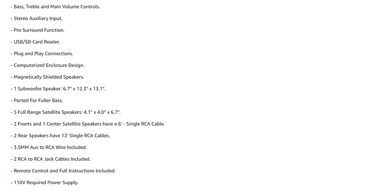 • Highest Quality - Powered Subwoofer Speaker Is 12. 3" X 6. 7" X 13. 1", 20Hz-20 Khz, 5 Wired Satellite Speakers Are 6. 7" X 4. 1" X 4" Each, 2 Fronts And Center Satellite Speakers Have A 6 Foot Single Rca Cable, 2 Rear Speakers Have 12 Foot Single Rca Cables