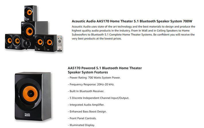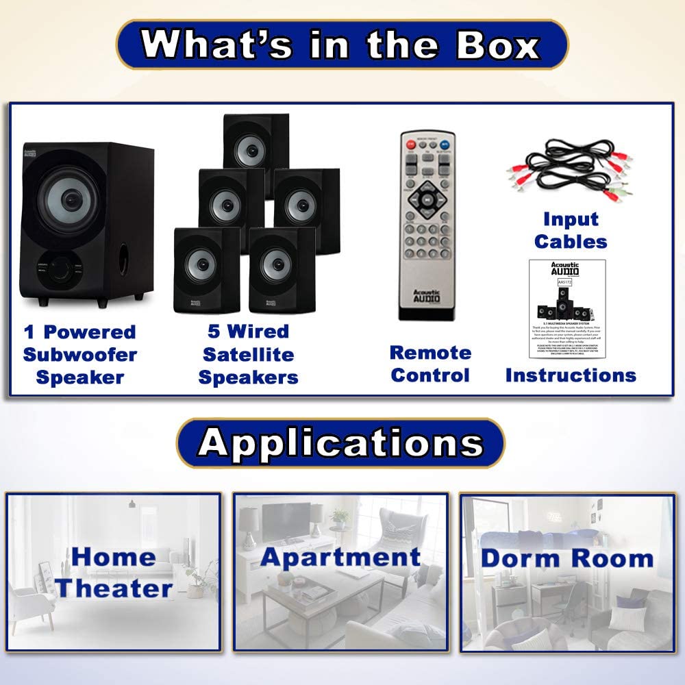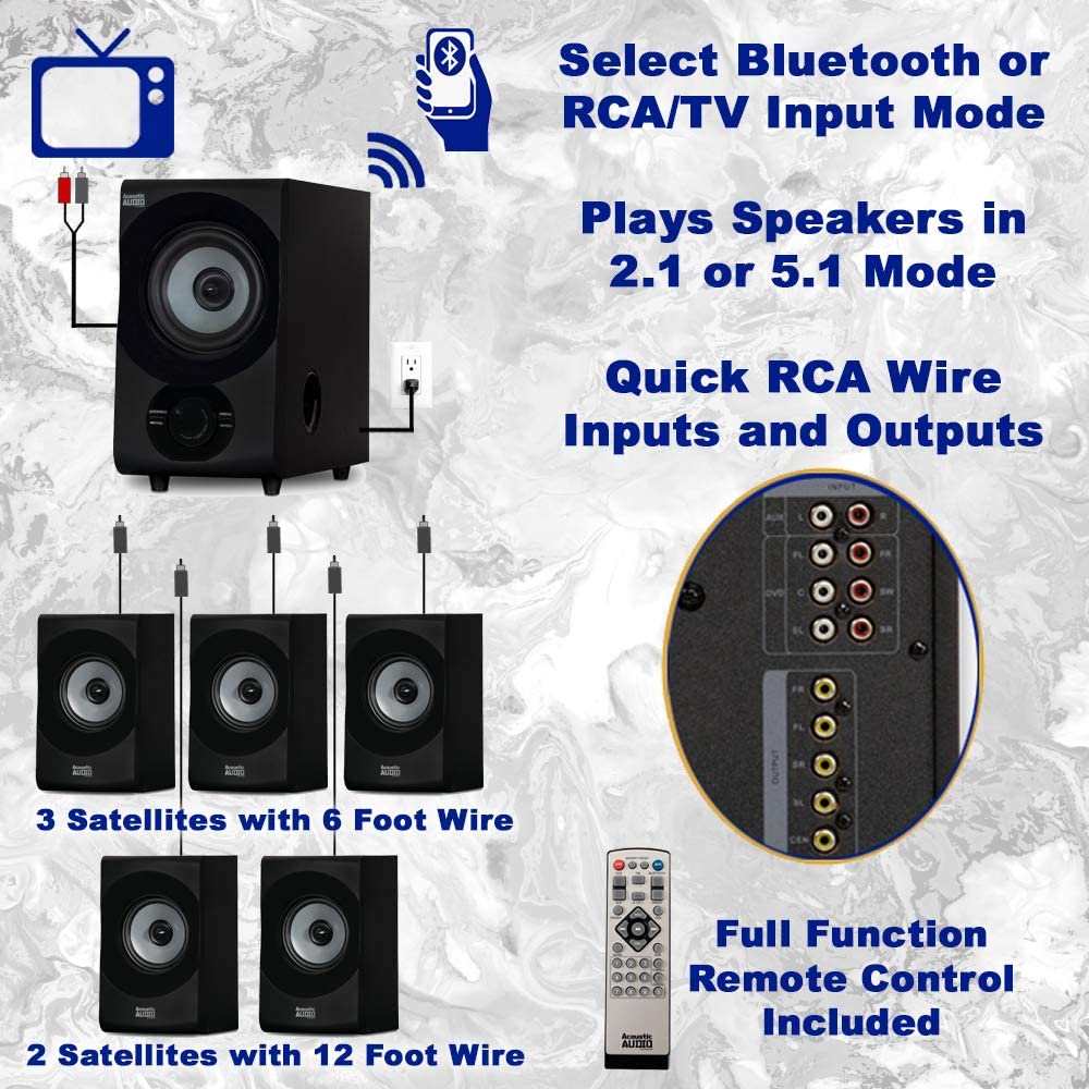 Acoustic Audio by Goldwood AA5172 Bluetooth 5.1 Speaker System Stream music from your phone to the built in Bluetooth Receiver Integrated Power Amplifier with 700 Watts System Power Pro Surround Function Automatically Converts Stereo to 5.1 Sound Easy Plug and Play Connections. Standard RCA inputs connect to most audio sources 6 Independent RCA Inputs for True Surround Stereo RCA AUX Inputs Illuminated Display with Front Panel Controls USB Drive Input and SD Card Input FM Tuner Full Function Remote Magnetically Shielded Wired Satellite Speakers 1 Powered Subwoofer Speaker is (H x W x D) 12.3" x 6.7" x 13.1". Frequency Response is 20Hz-20 kHz Enhanced Bass Boost Ported Design 5 Wired Satellite Speakers are (H x W x D) 6.7" x 4.1" x 4" each 2 Front and 1 Center Satellite Speakers have 6 Foot Single RCA Cables 2 Rear Speakers have 12 Foot Single RCA Cables System Requirements Standard US 110V Grounded Wall Plug Any audio device with a standard 3.5mm Headphone, RCA Stereo or RCA 6 Channel Surround Audio Outputs Search AA5170D for this model with Smart TV Digital Optical Input Applications TV or Home Entertainment System Laptop or Personal Computer DVD or MP3 Player Cell Phone or Tablet Gaming What's in the box 1 Powered Subwoofer Speaker 5 Passive Wired Satellite Speakers Full Function Remote RCA Antenna Cable 3.5mm to RCA Cable RCA to RCA Jack Cable Instruction Manual