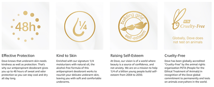 • Certified cruelty free; globally, Dove does not test on animals and is certified cruelty-free by peta