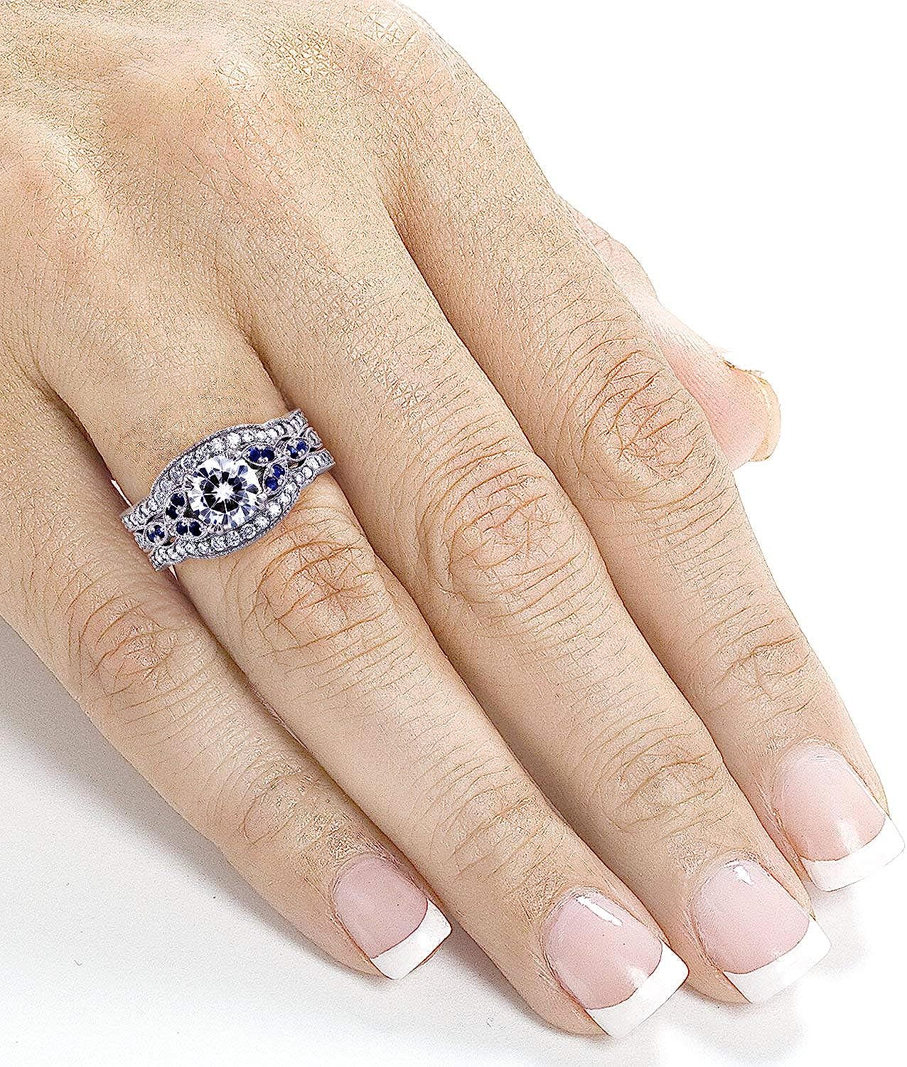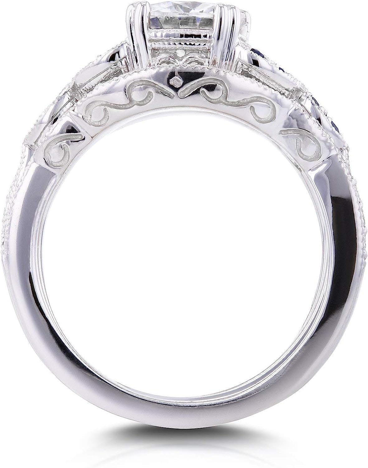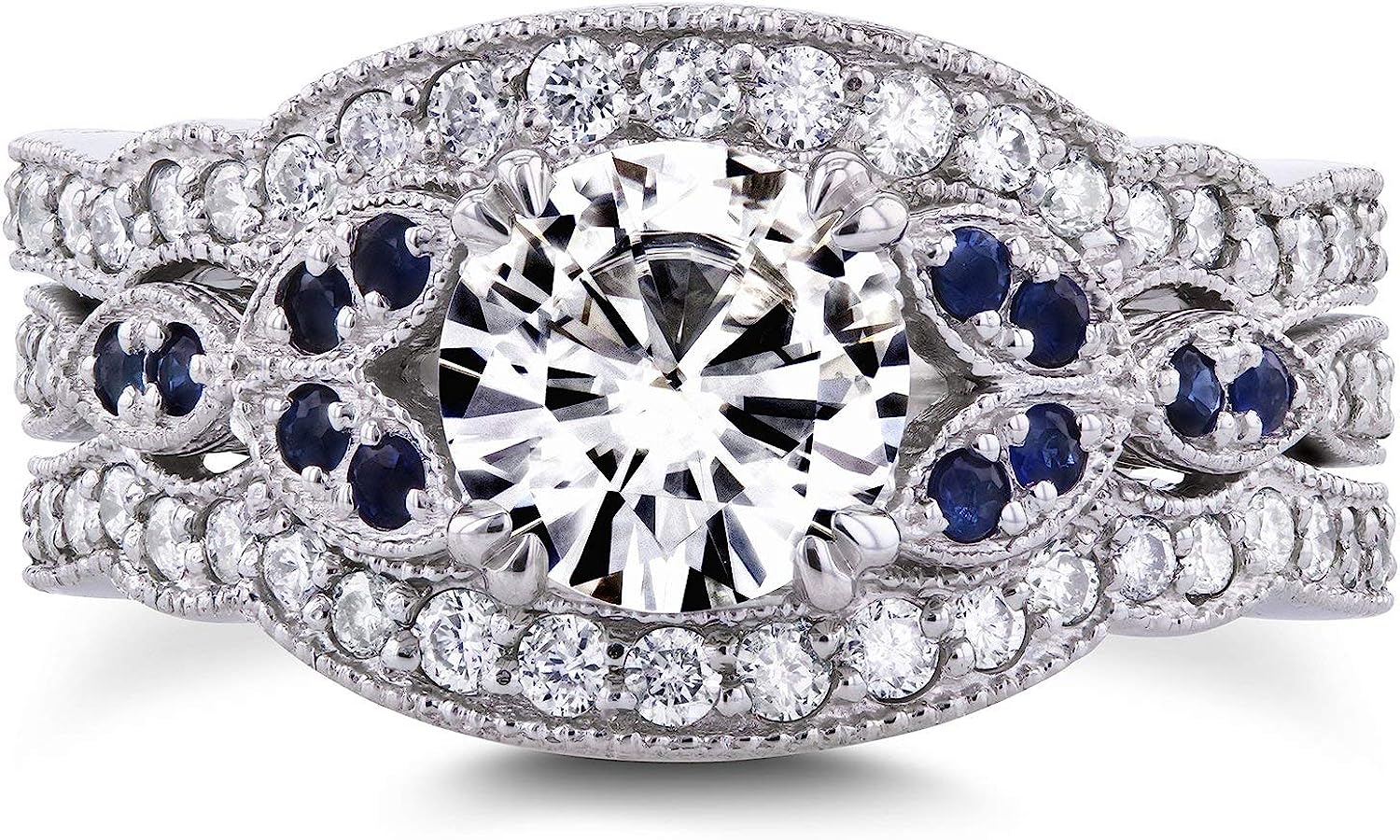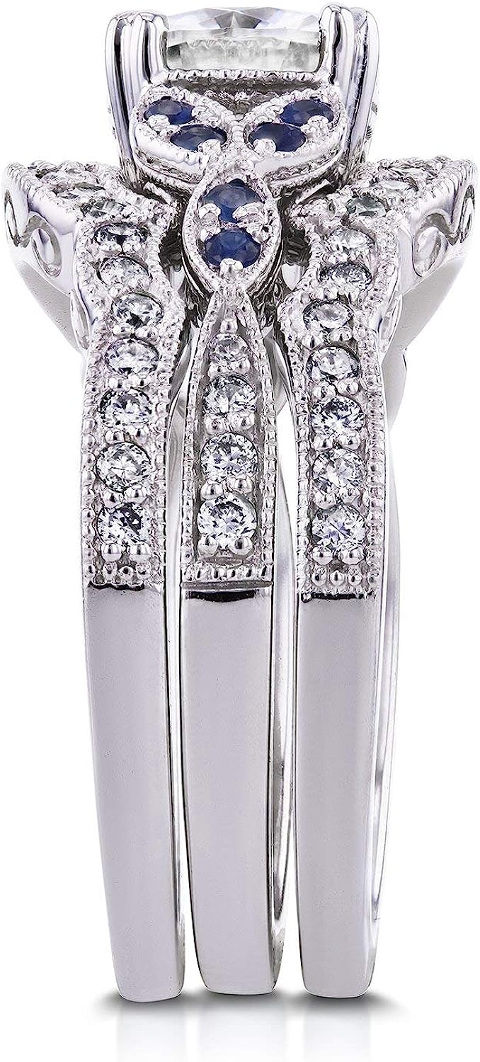 Kobelli Antique Style Forever One (D-F) Moissanite and Blue Sapphire 3 Piece Bridal Set 1 2/5 CTW in 14k White Gold