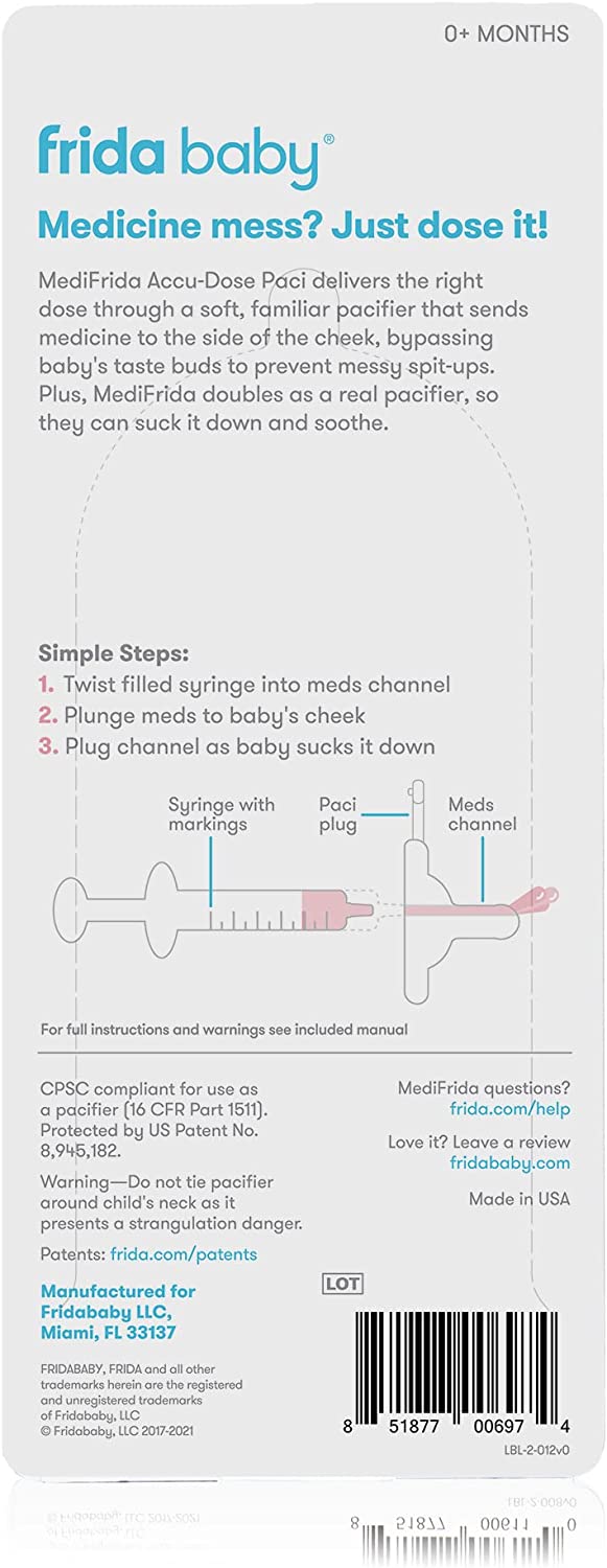 SYRINGE: Included syringe features markings for common medicine doses, but any standard syringe can be used with paci.DOUBLE DUTY: Close tab on paci to double as a real pacifier after dosing.BPA FREE: Both pacifier and syringe are BPA free and dishwasher safe making it easy to clean and safe to use