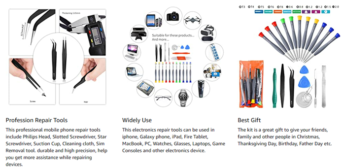 - 【 SAFETY 】 for your personal equipments : fix by yourself with this professional-grade repair kits to protect privacy from strangers; you needn't to ask help from friends or wait for repairing technician or look for a repair center. This electronics repair tools kits can not only save your money and time but protects your personal privacy!