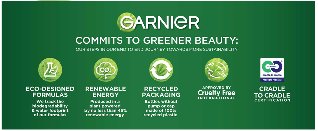 • Garnier is committed to Greener Beauty - our bottles excluding pumps and caps are made of 100% Recycled Plastic