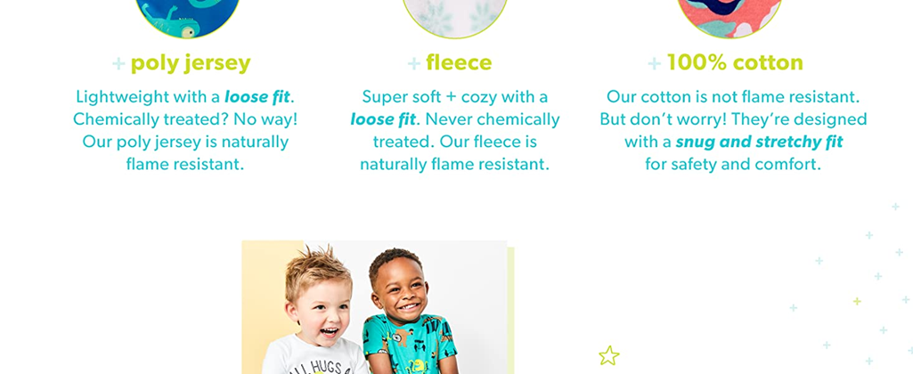 • Our polyester/fleece sleepwear is flame resistant and free of chemical treatments