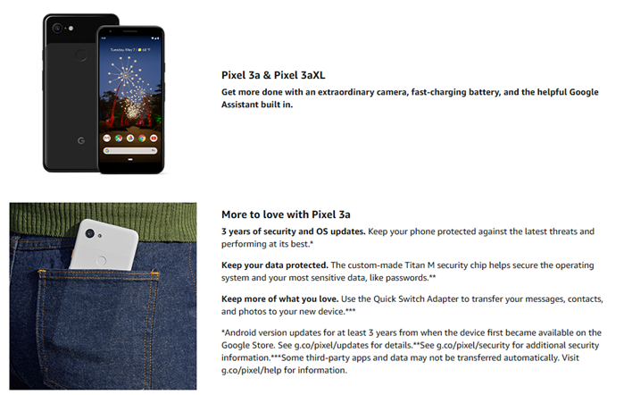 Get more done with Pixel 3A. It has an extraordinary camera with features like night sight, portrait mode, and HDR+. A battery that charges fast and lasts all day [7]. All the helpfulness of the Google assistant built in. And 3 years of security and OS updates included [8]. It’s everything you love about Google – in a phone. Works with all major carriers. 1 Google photos offer free unlimited online storage for all photos and videos uploaded in high-quality. Photos and videos uploaded in high-quality may be compressed or resized. Requires Google account. Data rates may apply. 2 US and Canada only. English only. 3 approximate battery life based on a mix of talk, data, standby, mobile Hotspot and use of other features, with always on display off. An Active display or data usage will decrease battery life. Charging rates are based upon use of the included charger. Charging time performance Statistics are approximate. Actual results may vary. 4 Android version updates for at least 3 years from when the device first became available on the Google store. 5 some third-party apps and data may not be transferred automatically. 6 approximate battery life based on a mix of talk, data, standby, mobile Hotspot and use of other features, with always on display off. An Active display or data usage will decrease battery life. Charging rates are based upon use of the included charger. Charging time performance Statistics are approximate. Actual results may vary 7 Android version updates for at least 3 years from when the device first became available on the Google store.