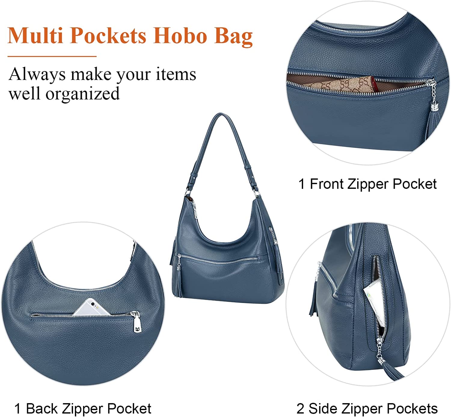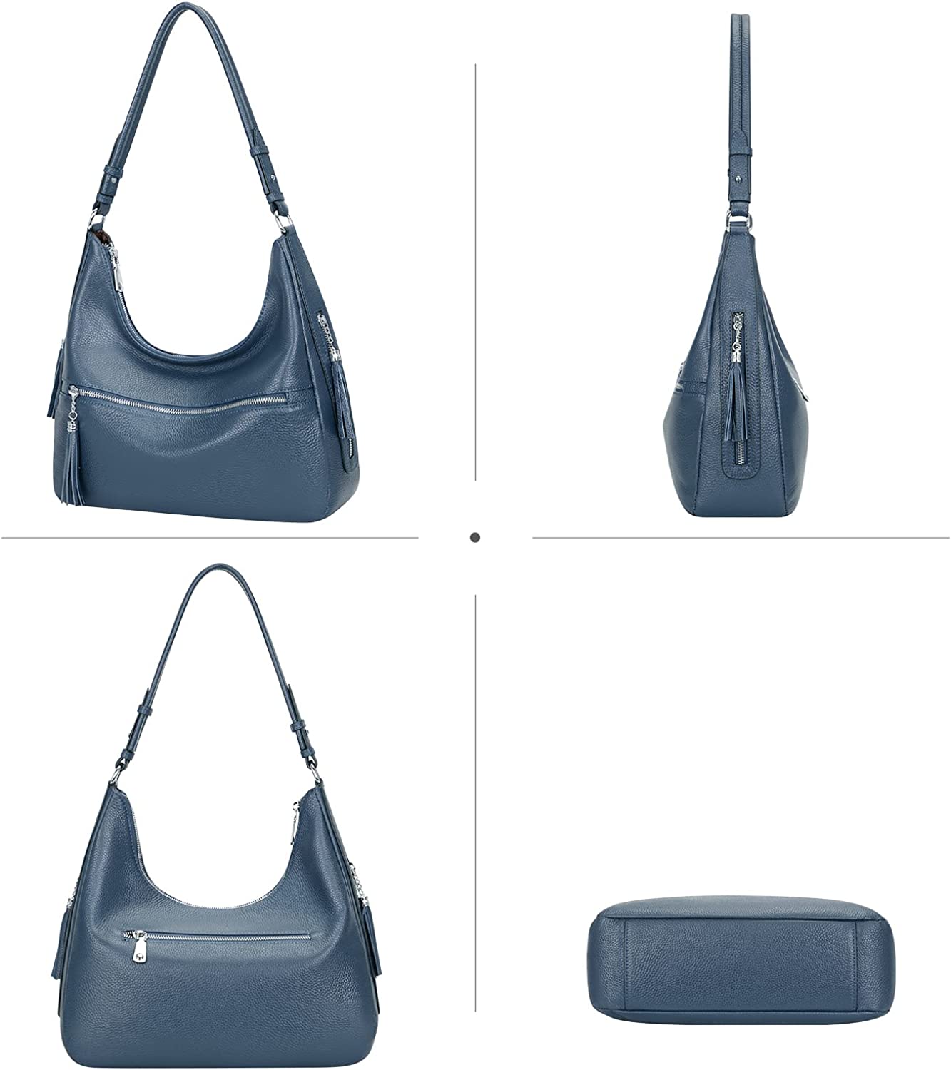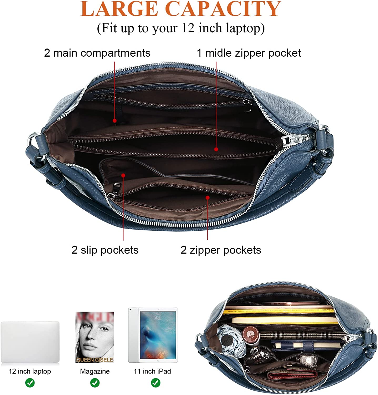 • Structure & Capacity –– U shape zipper to a large compartment. Internal: 2 main compartments separated by 1 middle zipper pocket, 2 slip pockets at the inner front side and 1 small zipper pocket in the back side. External: 1 front zipper pocket, 1 back zipper pocket, 2 small side pockets fit small item. This shoulder hobo bag could hold your 12 inch Macbook, 9.7 inch iPad, wallet ,keys, cell phone,perfume,cosmetic and other daily necessary.