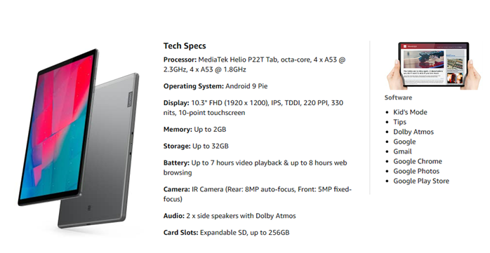 The Lenovo Tab M10 Plus is here to exceed your expectations. Part of the 2nd generation Tab family, this media tablet is designed for the whole family. Outside, the standout metal design and premium look and feel combine with modern simplicity. With a full metal back cover, narrow bezels, and high panel-to-body ratio, you'll love the clean look. The 10.3" FHD screen and dual speakers tuned by Dolbsy Atmos deliver immersive entertainment. Inside, this useful tablet device has an Octa-Core processor with up to 2.3 GHz main frequency, 64GB storage and 4GB RAM, and runs on the Android 9 Pie operating system to deliver fast, powerful performance.
