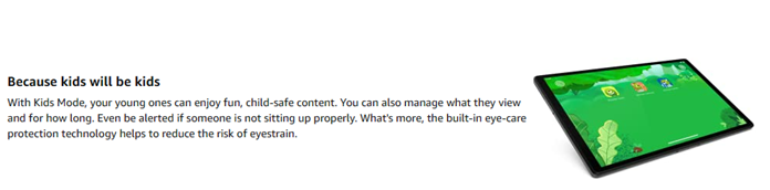 Created for everyone in the family to enjoy, the Lenovo Tab M10 Plus includes Kid's Mode with dedicated content, parental control, and specialized eye protection. The bumpy environment alert and posture alert let you know when this Android tablet isn't being used correctly.
