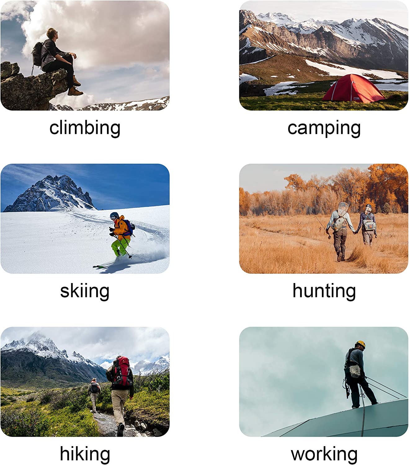 mountaineering、running、walking、cycling、exercise、hiking、trekking、camping、climbing、traveling、outdoor activities,and longtime outdoor work.