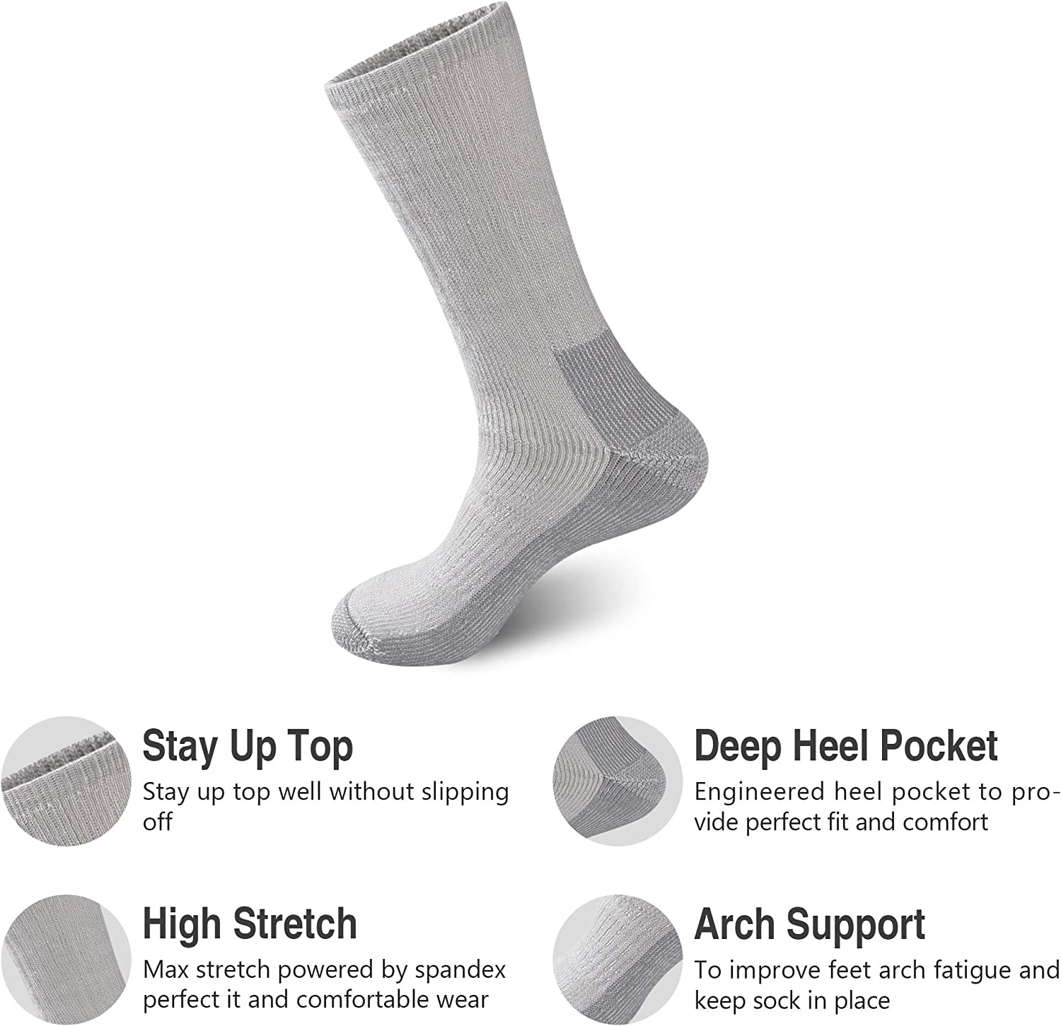 Merino Wool is a natural moisture management fiber that wicks moisture and Super soft to provides natural comfort for all seasons.Each pair is cushioned throughout and reinforced from heel to toe for maximum comfort and durability. These wool cushion crew socks designed for extreme weather conditions, great cold weather gear for outdoor activities and sports like skiing.