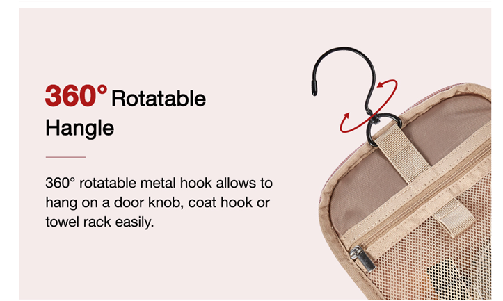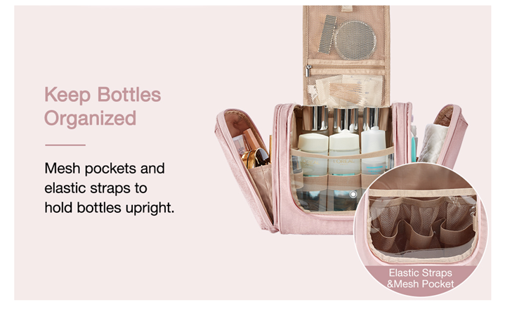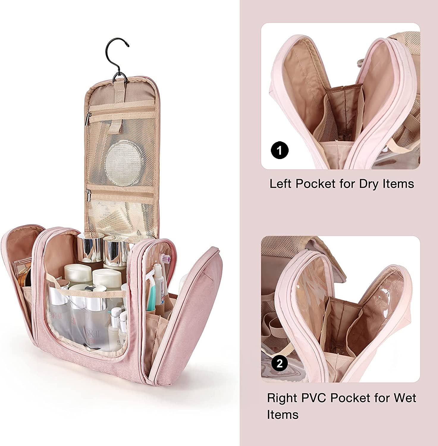 • Special Design - Inner pockets with elastic straps hold bottles upright. Two side pockets of travel toiletry bag can keep the wet/dry items separated. The right side pocket with PVC material is easy to clean and dry, perfect for makeup brushes, toothbrushes, wet towels. Stow-away 360 degree swivel non-slip metal hook for versatile hanging options.Can be gifts for Women on Black Friday,Cyber Monday,Christmas day.