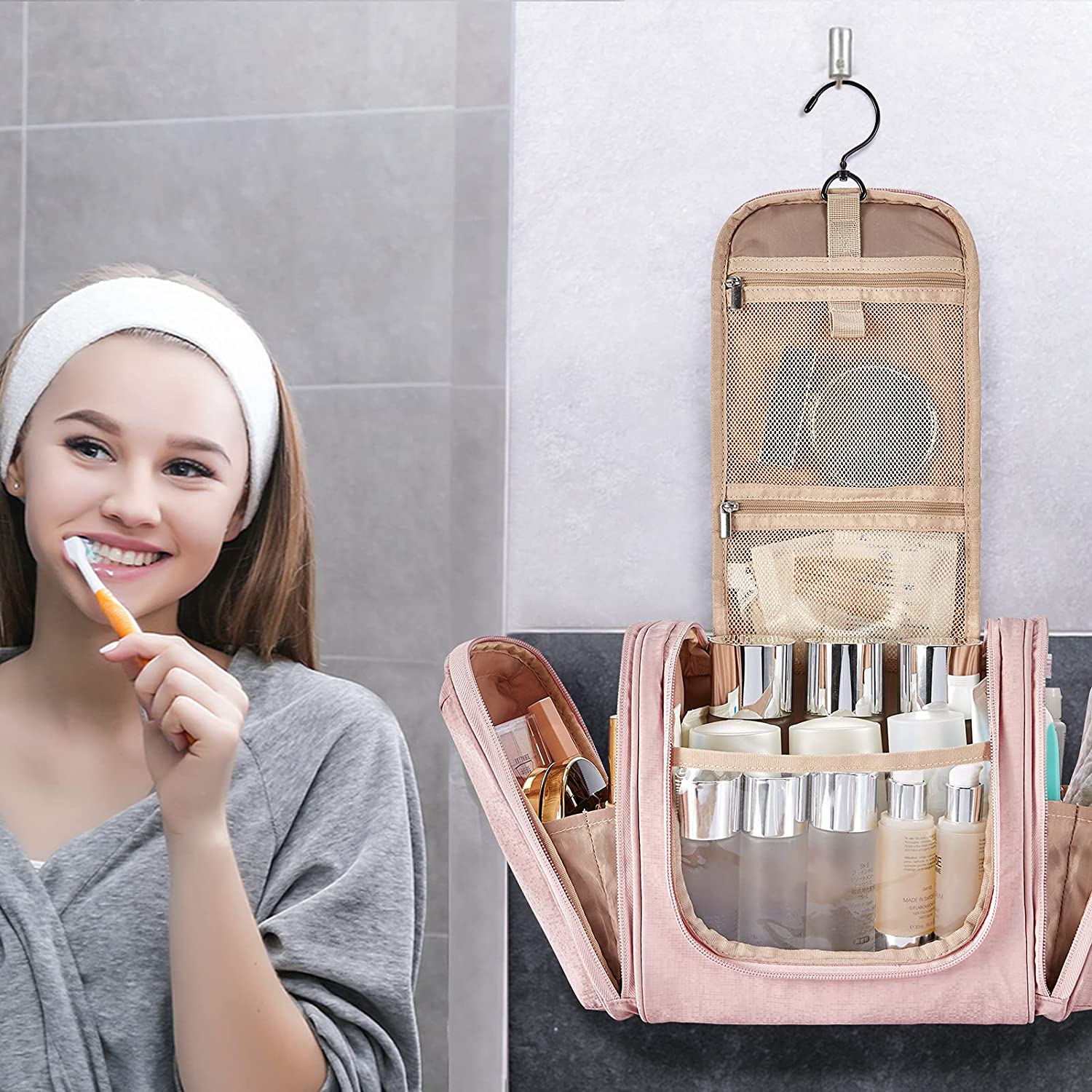 BAGSMART Toiletry Bag for Women, Travel Toiletry Organizer with hanging hook, Water-resistant Cosmetic Makeup Bag Travel Organizer for Shampoo, Full Sized Container, Toiletries, Pink