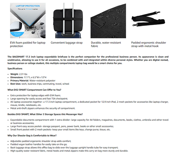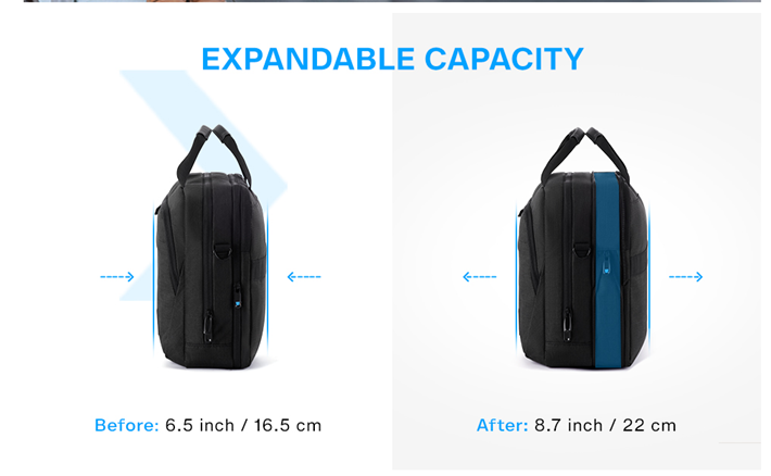- EXPANSION & MULTIPLE COMPARTMENTS- 17.1"L x 6.5''(up to 8.7'') W x 13"H; weight: 2.31 lbs. The expansion zipper makes it more flexible, the laptop briefcase can be transformed as a large duffel bag when necessary. Up to 4 compartments can meet all your needs well. The large tech compartment can fit up to 17-17.3 inch laptop. Two front pockets allow you to put daily necessities in an organized manner.The expandable document compartment can storage your A4 folders, magazines, clothes or umbrella.