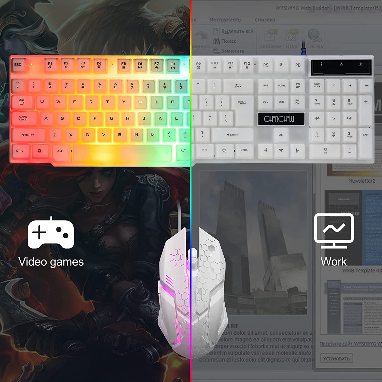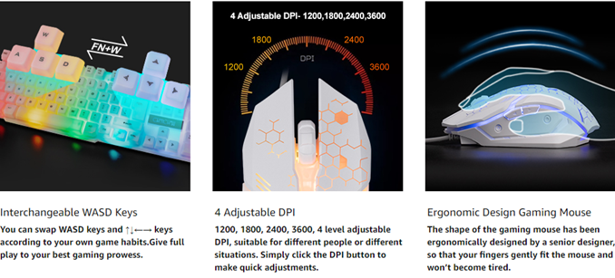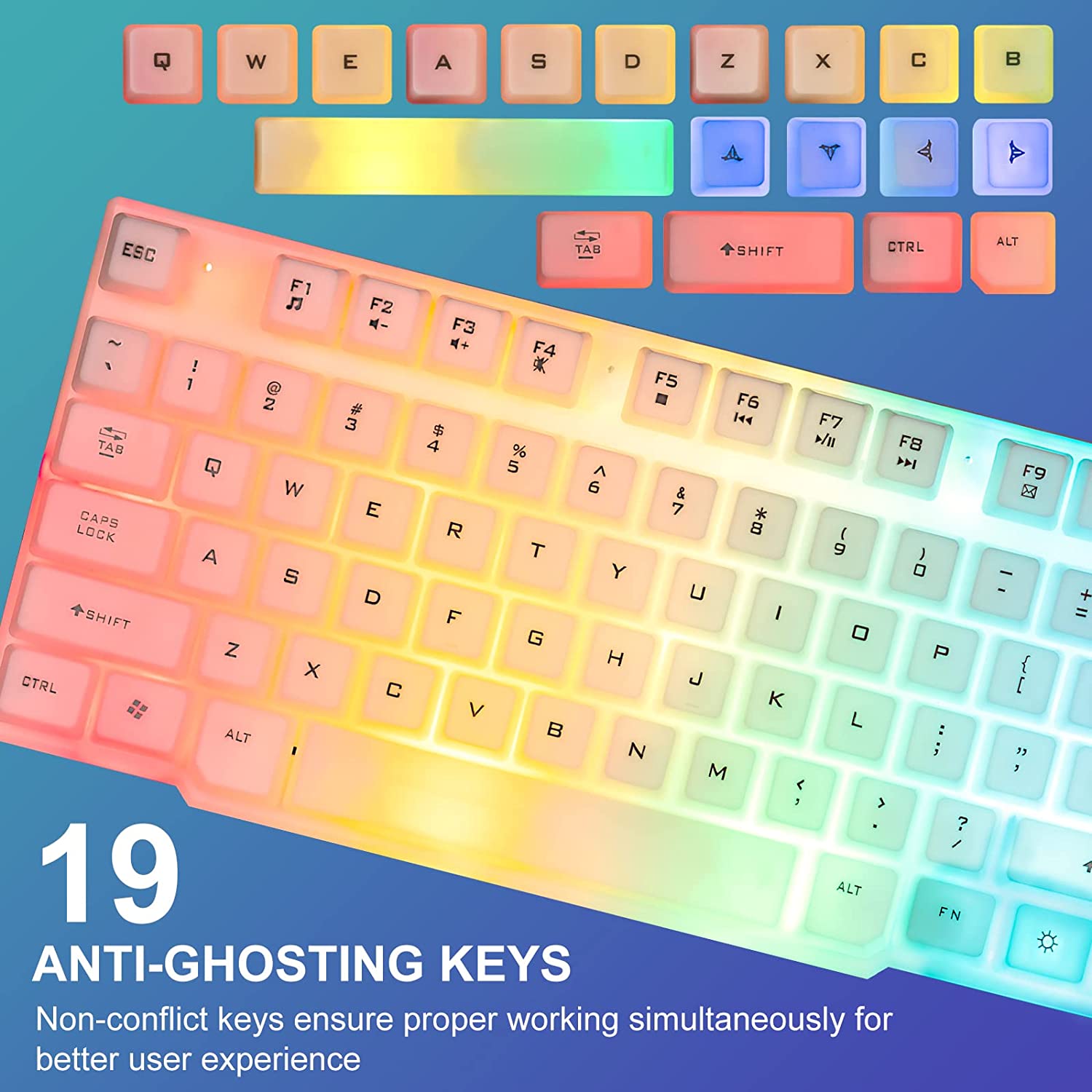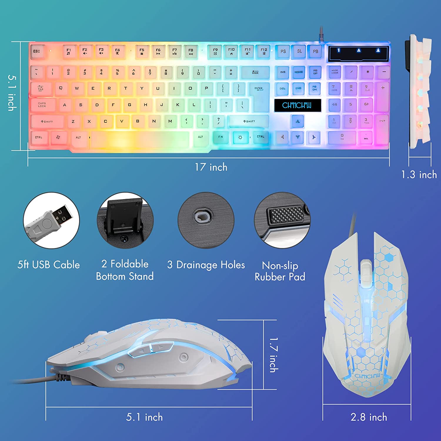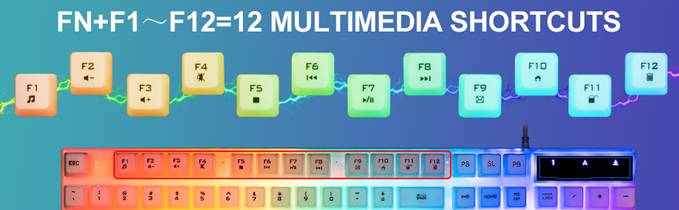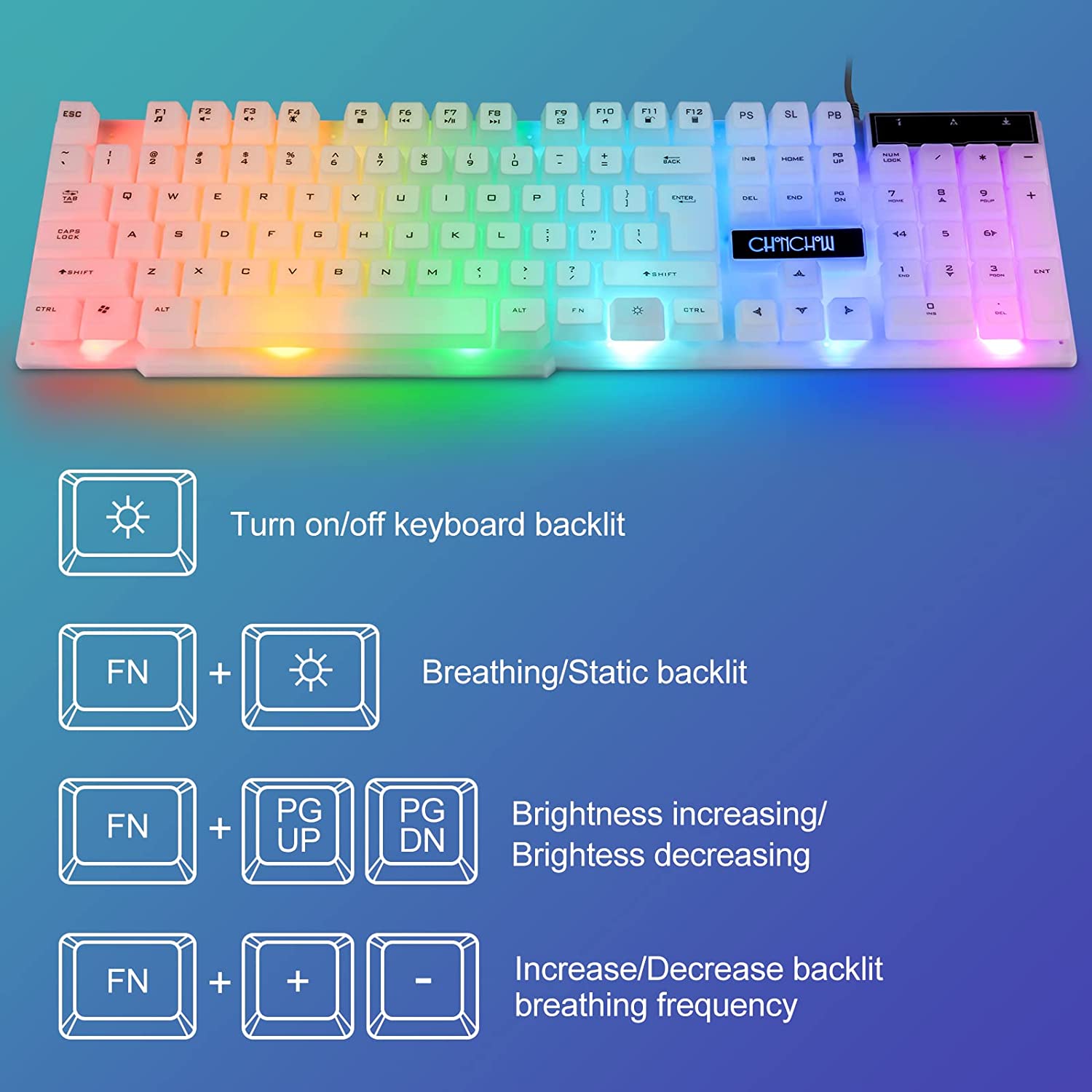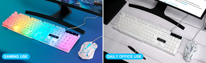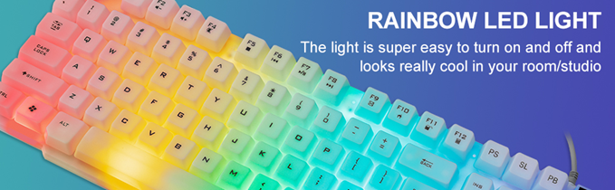 • 【Rainbow LED Gaming Keyboard】 The rainbow LED keyboard, with rainbow backlighting and white keycaps has a highly-translucent effect, bringing you the ultimate gaming atmosphere. With a choice of static/breathing mode lights, you can also adjust the backlight brightness and breathing speed, or turn off the backlight when you don't need it. Great for gaming or work.