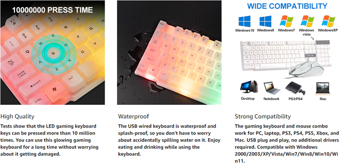 • 【After-sales Guarantee, Strong compatibility】 If you have any quality problems, please contact customer service. We will be happy to serve you. We offer a 30-day refund or replacement for quality issues and a 12-month warranty. The gaming mouse and keyboard combo is suitable for PC, PC, laptop, PS3, PS4, PS5, Xbox, and Mac. USB plug and play, no additional drivers required. Compatible with Windows 2000/2003/XP/Vista/Win7/Win8/Win10/Win11.