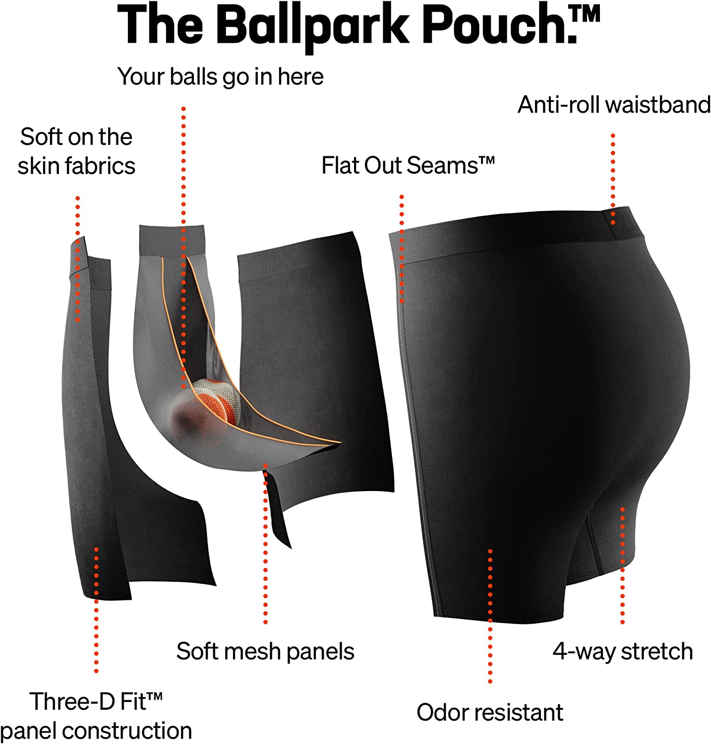 BALLPARK SUPPORT: Our boxer briefs come equipped with the patented BallPark Pouch to reduce friction and keep your man-parts in place with breathable mesh panels for chafe-free comfort.