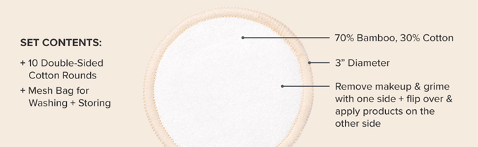 • CONTENTS: 10 machine-washable 3” bamboo-cotton blend rounds and 100% cotton 4.5” x 5.5” zippered laundry bag