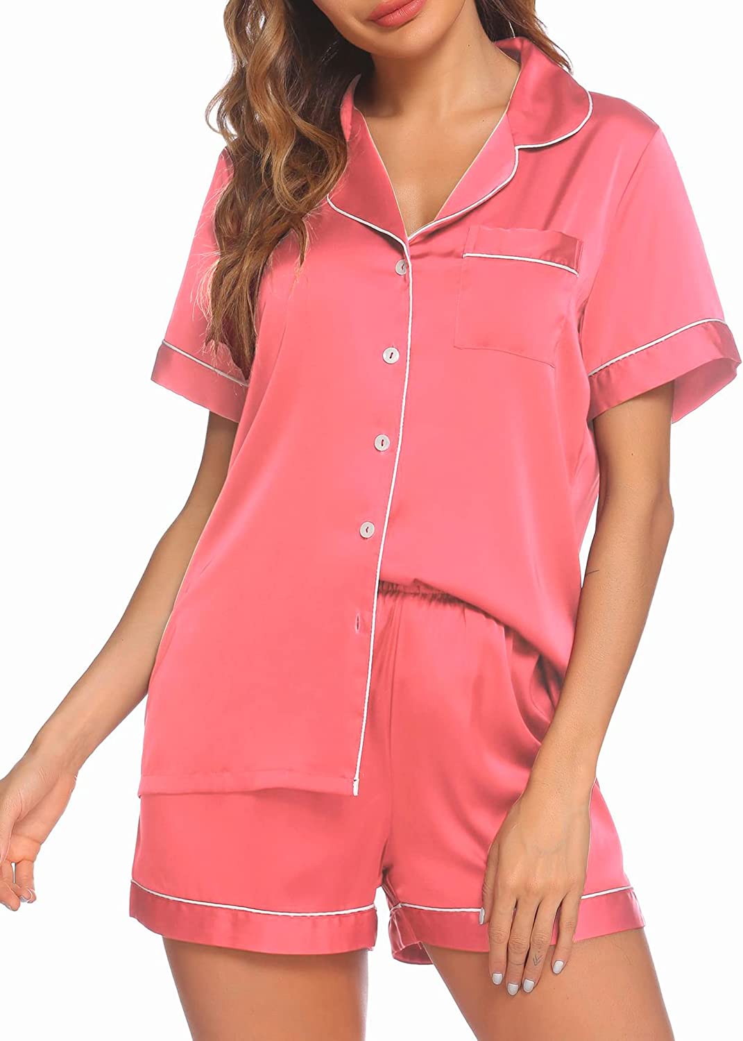 Pajama Top:Short sleeve sleepwear with notch collar,button front pajamas shirt and one chest pocket design.Lightweight and Skin-friendly silk pajamas for women.Great for sleeping,casual wear or lounging around the house or yard all day